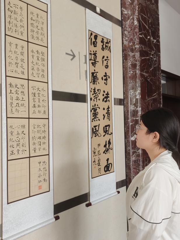 參展作者李時尚表示,通過此次展覽將廉潔意涵訴諸筆墨,真切感受到樹立求實求新、風(fēng)清氣正的品格對于扣好“人生第一粒扣子”的重要性。作為畢業(yè)生,他將繼續(xù)牢記老師教誨,涵養(yǎng)高尚人格、培養(yǎng)良好作風(fēng),為步入工作崗位打下堅實的思想和能力基礎(chǔ)。