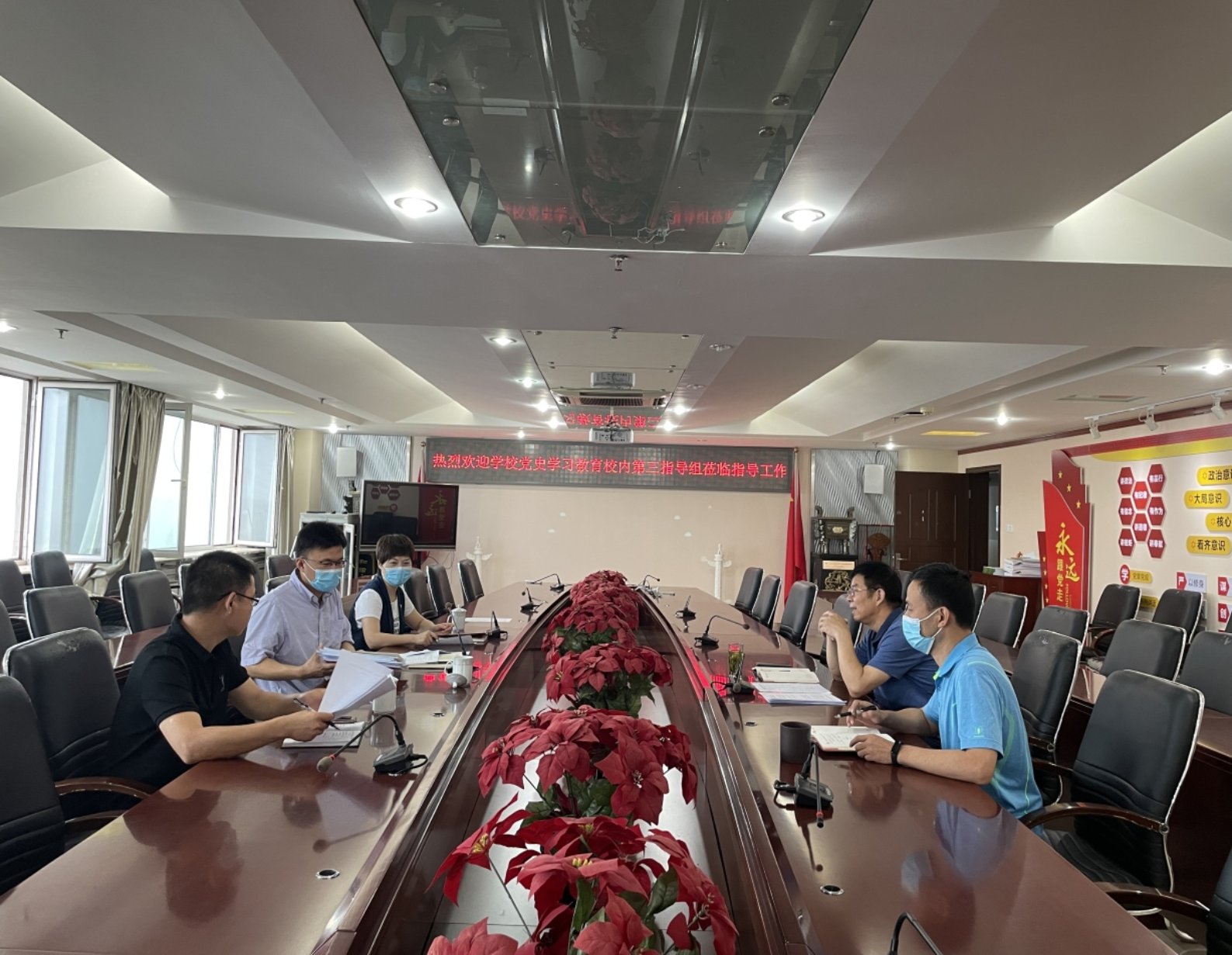 6月25日上午8:30,學校黨史學習教育校內第三指導組張萌萌同志、楊海濤同志、王俊峰同志到文法與管理學院黨總支指導工作。