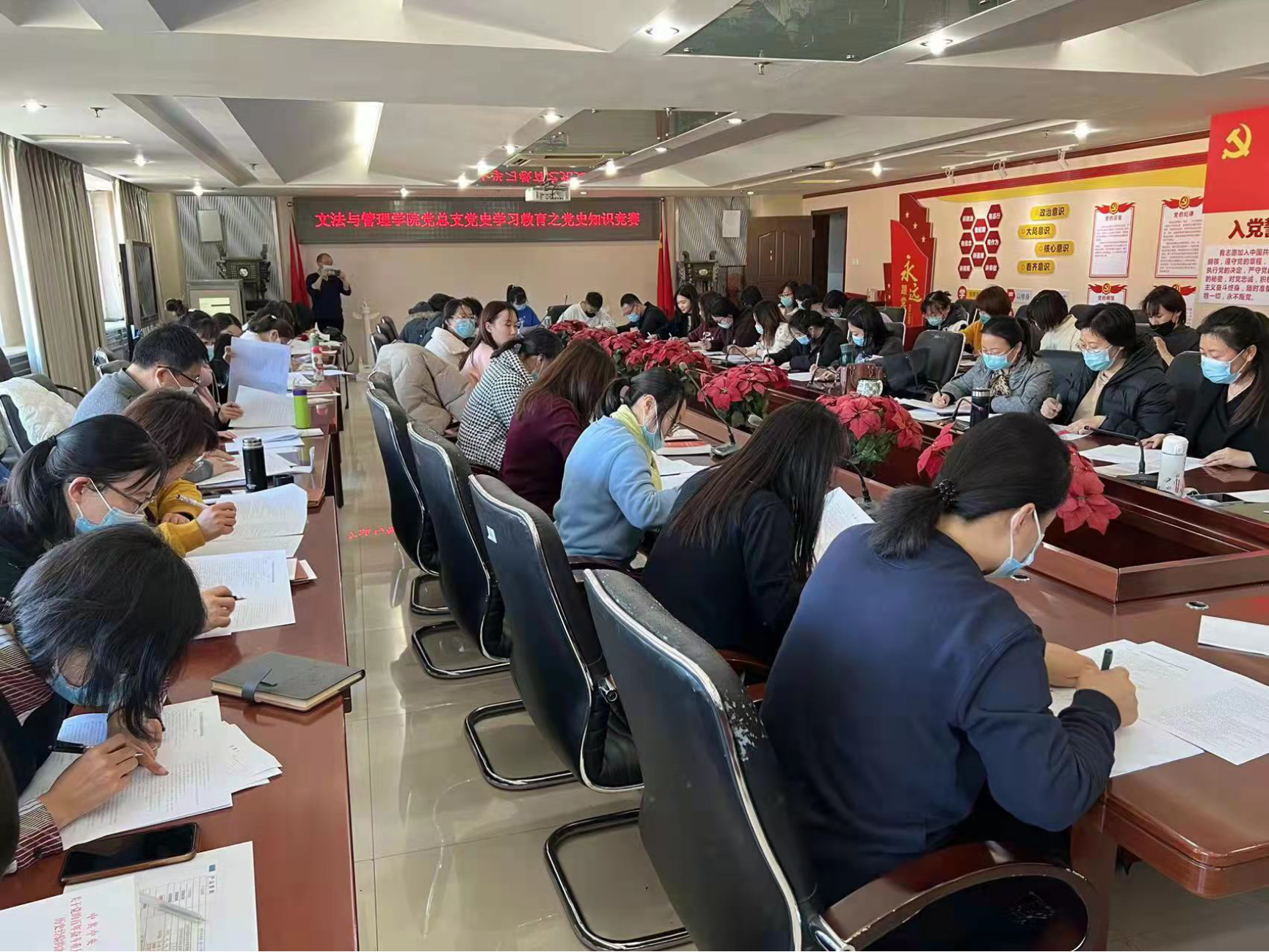 為深入推進黨史學習教育,激勵全院師生黨員扎實學習黨史知識,進一步提升學史明理、學史增信、學史崇德、學史力行成效,根據學院《黨史學習教育實施方案》安排,2021年11月26日下午,文法與管理學院黨總支黨史學習教育黨史知識競賽在匠心樓十層黨員之家舉辦了黨史學習教育--黨史知識競賽,學院80名師生黨員參加了競賽。