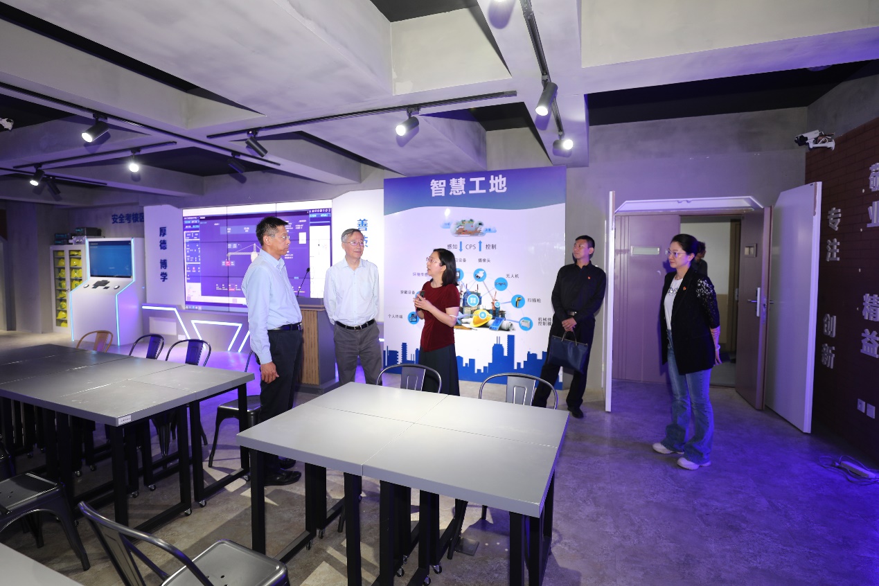會后,指導組在高喜軍書記陪同下,參觀了我校中法施耐德能效管理應用人才培養和研究中心、汽車實訓基地、數字化設計技術應用中心、BIM實訓中心、智能建造工程中心等。