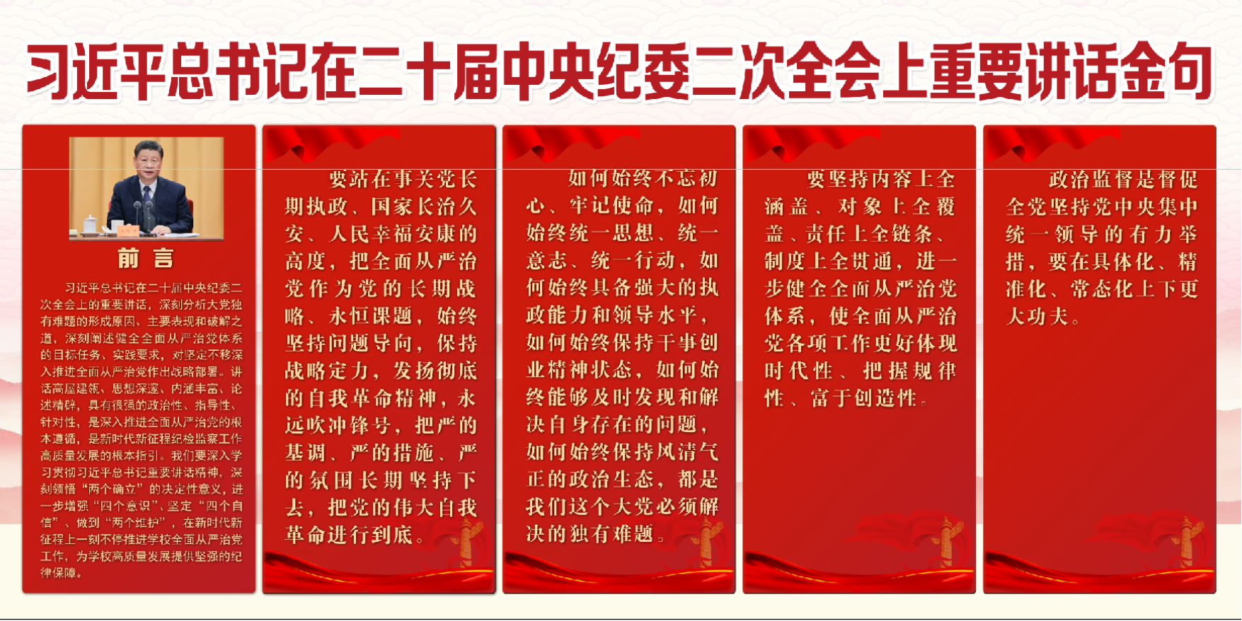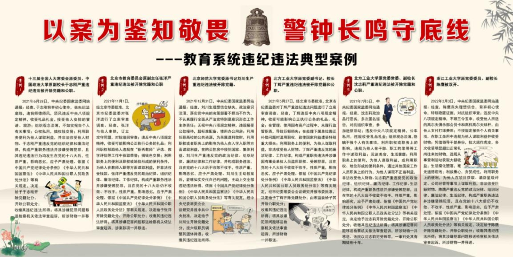 為深入貫徹黨的二十大精神,推動學習貫徹習近平新時代中國特色社會主義思想主題教育走深走實,不斷強化黨員干部廉潔意識,筑牢拒腐防變思想防線,學校紀委制作了一期警示教育宣傳展板,在學校匠心樓一層大廳進行展示。專題展主要分三個部分“習近平總書記在二十屆中央紀委二次全會上的講話金句、警鐘長鳴——教育系統違紀違法典型案例、嚴守底線——教育系統違反中央八項規定典型案例”。