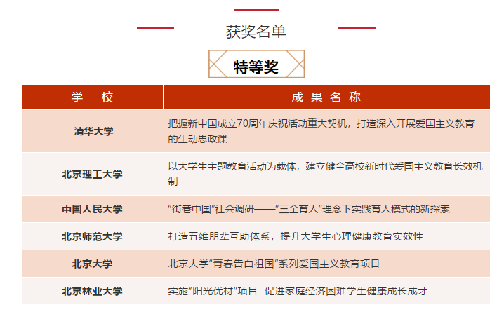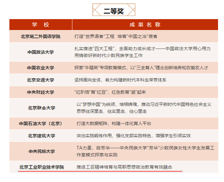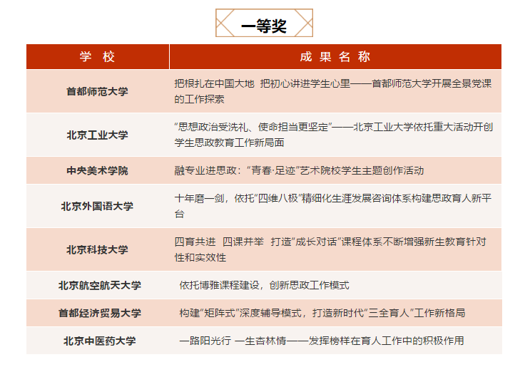 為深入學習貫徹習近平新時代中國特色社會主義思想,進一步推動全國教育大會、全國高校思想政治工作會議和學校思想政治理論課教師座談會精神落細落實,總結展示各高校在大學生思想政治工作中的進展與成效,交流推廣好做法、好舉措、好經驗,市委教育工委組織開展了第六屆首都大學生思想政治工作實效獎的申報和評選工作,共有50所高校提交112項申報材料。最終,評定優秀成果獎特等獎6項、一等獎8項、二等獎10項、優秀獎31項。