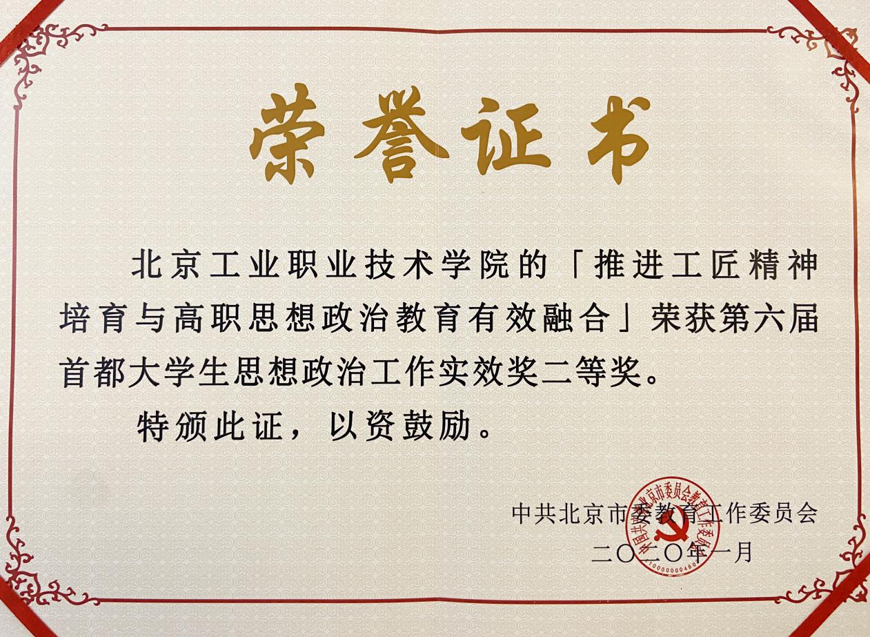 近日,北京市委教育工委頒發了第六屆首都大學生思想政治工作實效獎獲證書,我校申報的“推進工匠精神培育與高職思想政治教育有效融合”項目榮獲二等獎。