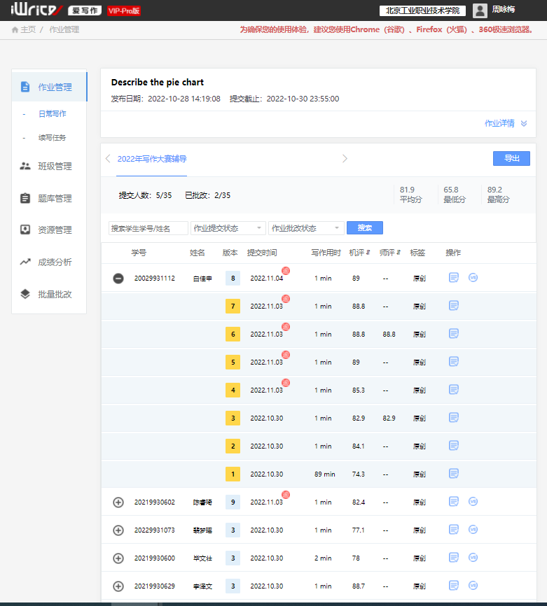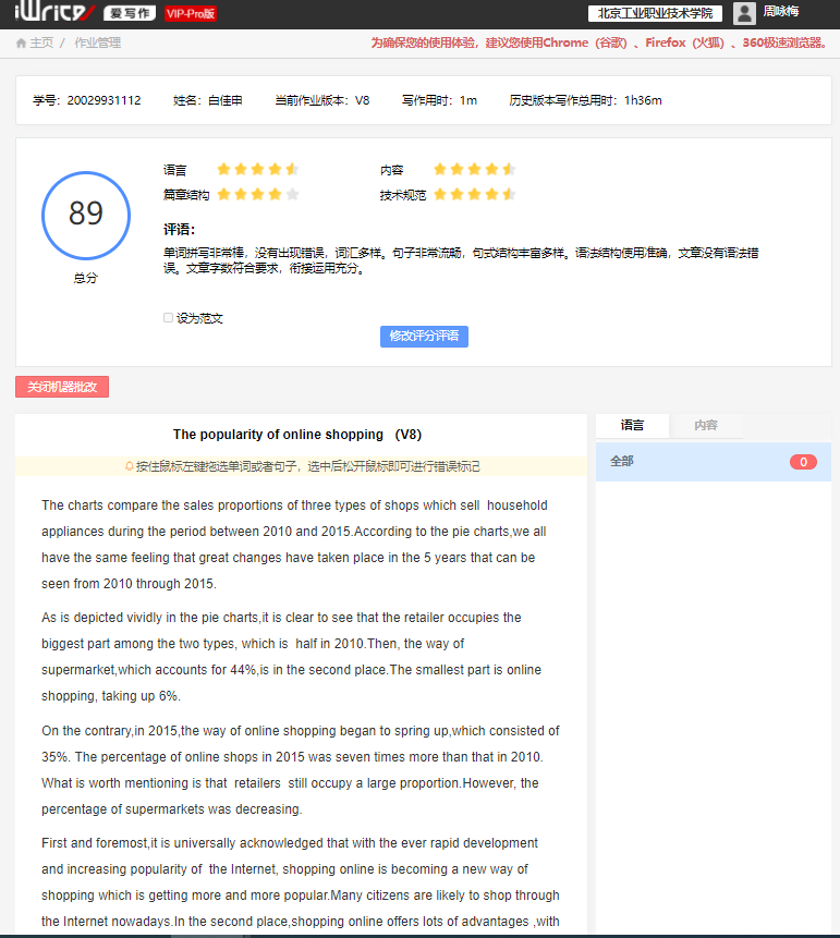 “中國教育電視臺·外研社杯”職場英語挑戰賽寫作大賽(高職組)是由教育部職業院校外語類專業教學指導委員會指導、外語教學與研究出版社主辦的面向高職高專學生的全國性公益賽事。大賽本著“以賽促教”、“以賽促學”、“以賽育人”的理念,助力高等職業院校人才培養模式創新和外語教育教學改革。學生用文字闡述觀點、用語言表達思想,所取得的驕人的成績,也凝結著指導教師,以及指導教師所在的公共英語教研室所有英語教師團隊的不懈的努力和辛勤的汗水。一年來,公共英語教研室在學院領導的帶領下,多次進行線上線下教研活動,研討寫作教學的新模式,充分利用各種信息化手段,提高寫作教學效率。我院孫川副院長帶領英語教研室教師跟外研社合作的課題:基于iWrite智能評閱平臺的英語寫作教學策略研究,以高職學生為樣本,追蹤其在使用iWrite平臺過程中英文寫作各個維度的成績變化,結合成績分析,爭取達到運用現代信息技術輔助傳統英語寫作教學,優化教學質量的效果。寫作大賽的選手們充分利用了這一教學資源,在iwrite 寫作平臺進行線上寫作,從開始的滿篇紅色錯誤提示到最后的零錯誤,學生的作文成績一次比一次高,信心也一次比一次足。
