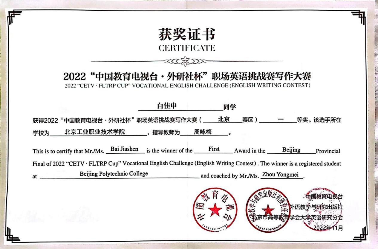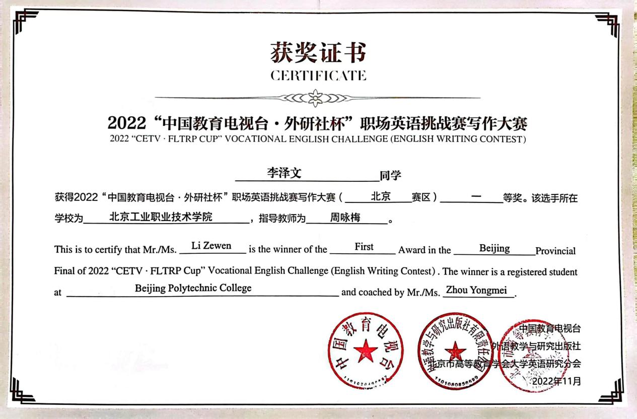 由中國職業技術教育學會、中國教育報刊社共同指導,中國教育電視臺、外語教學與研究出版社聯合主辦的“中國教育電視臺·外研社杯”職場英語挑戰賽寫作大賽(高職組)北京賽區成績出爐。來自全市30余所高職院校的50多名學子以筆為鋒,競技文思,在挑戰賽的舞臺上精研寫作技能,淬煉語言藝術,展青春風采,綻時代芳華。我校大數據與會計2032班的李澤文同學、網絡2232班的白佳申同學、信息安全2131班的陳睿琦同學代表我校參加了此次大賽,李澤文、白佳申獲得一等獎,陳睿琦獲得三等獎,指導教師周詠梅老師獲得優秀指導教師獎。