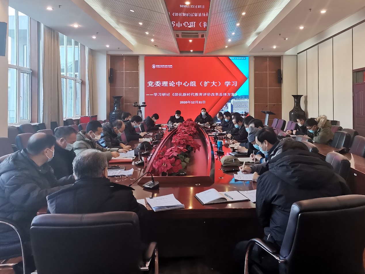 12月31日上午,學校黨委理論學習中心組在第四會議室召開理論學習擴大會,專題學習中共中央、國務院印發的《深化新時代教育評價改革總體方案》(以下簡稱《總體方案》),研究部署學校學習貫徹落實的意見。校黨委書記王偉主持學習會,黨委理論學習中心組成員,黨政辦公室主任、宣傳部長、學工部長、教務處長、人事處長、教學質量監控中心主任、黨總支書記、直屬黨支部書記參加了學習研討。