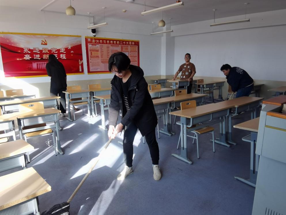 勞動現場,同學們在老師的帶領下,分工合作,各司其職,手拿掃帚、抹布等勞動工具,掃地、拖地、整理桌椅......一處不落地對教室、寢室進行了細致全面的清掃。在整個大掃除活動中,同學們體現出不怕臟、不怕累的精神,校園里處處涌動著老師們、同學們忙碌的身影,成為校園里一道靚麗的風景線。在大家齊心協力下,校園環境煥然一新,呈現出整潔、清新的新氣象。