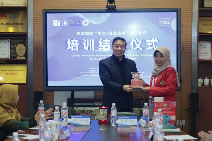 多位來華教師代表分享了本次培訓的收獲。來自馬來西亞的陳慈潤老師談到,這趟培訓之旅,讓老師們不僅增長了中文知識,更深入了解了中國的文化與人工智能技術。從傳統文化的熏陶到前線人工智慧科技的探索,從上課老師們的悉心指導到同學們的相互交流,老師們收獲滿滿。未來,老師們將帶著滿腔熱情,將所學所思應用于實際教學工作中,為促進中外文化交流與人工智能開發貢獻一份微薄的力量。越南的鄧玉輝老師表示,越南和中國山水相連、文化相通,中國和越南建立了全面戰略合作伙伴關系,兩國人文領域交流日益深化,民心距離不斷拉近。通過培訓,老師們對中國的科技發展印象深刻,獲得了許多關于人工智能領域的有益啟示,越南非常希望發展半導體技術和人工智能技術,希望能加強和我校合作。印度尼西亞的木力老師說,這次培訓中,對中文和中國文化、人工智能和信息技術的探索拓寬了我們的視野,并培養了友情,交流了知識,是一段十分難忘的經歷。在今后的教學中,將會將新學習的知識融入教學實踐中,造福子孫后代。