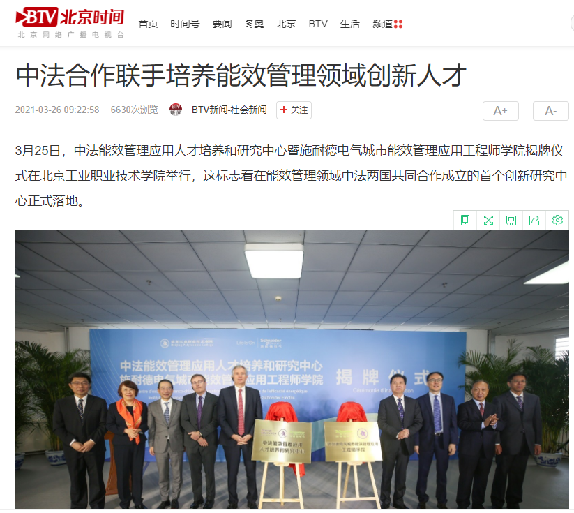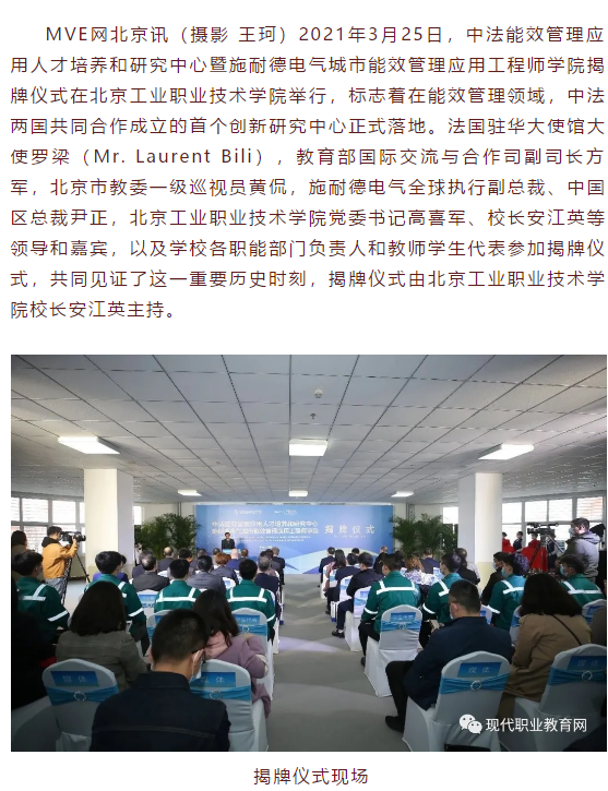 3月25日,中法能效管理應用人才培養和研究中心暨施耐德電氣城市能效管理應用工程師學院揭牌儀式在我校舉行。北京工業職業技術學院和施耐德電氣共建“中法能效管理應用人才培養和研究中心暨施耐德電氣城市能效管理應用工程師學院”是中法兩國推進職業教育國際合作典型代表,也是北京市深化產教融合的具體體現,對于推動首都職業教育高質量發展具有積極的借鑒意義。揭牌儀式受到了中國教育電視臺、中國教育報、中國新聞網、中國日報網、北京電視臺、北京商報、職教強國、現在職業教育網、職教之音等媒體的廣泛關注。