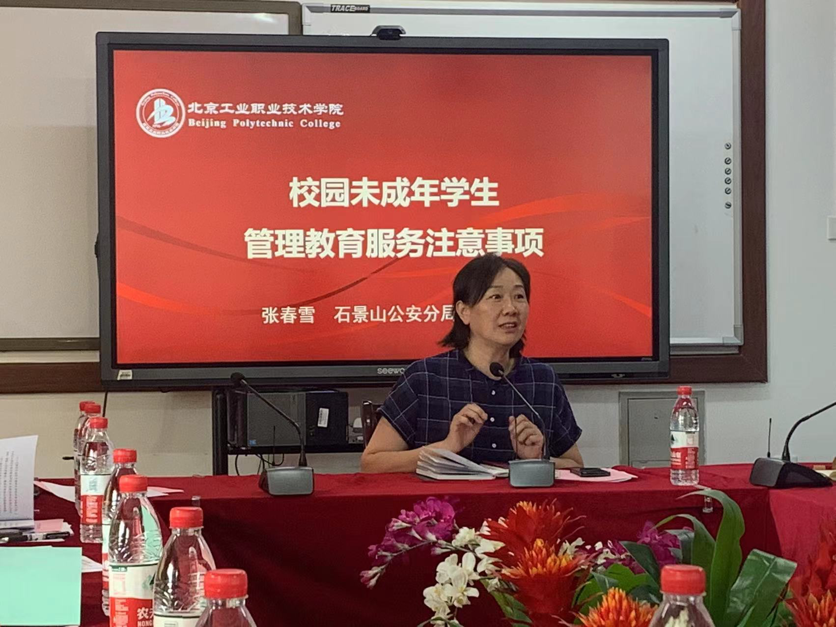 石景山公安分局駐校警官張春雪講解校園未成年學生管理服務注意事項,要求加強學生法制意識,提高自我保護能力,校地協同配合,共同做好學生安全工作。