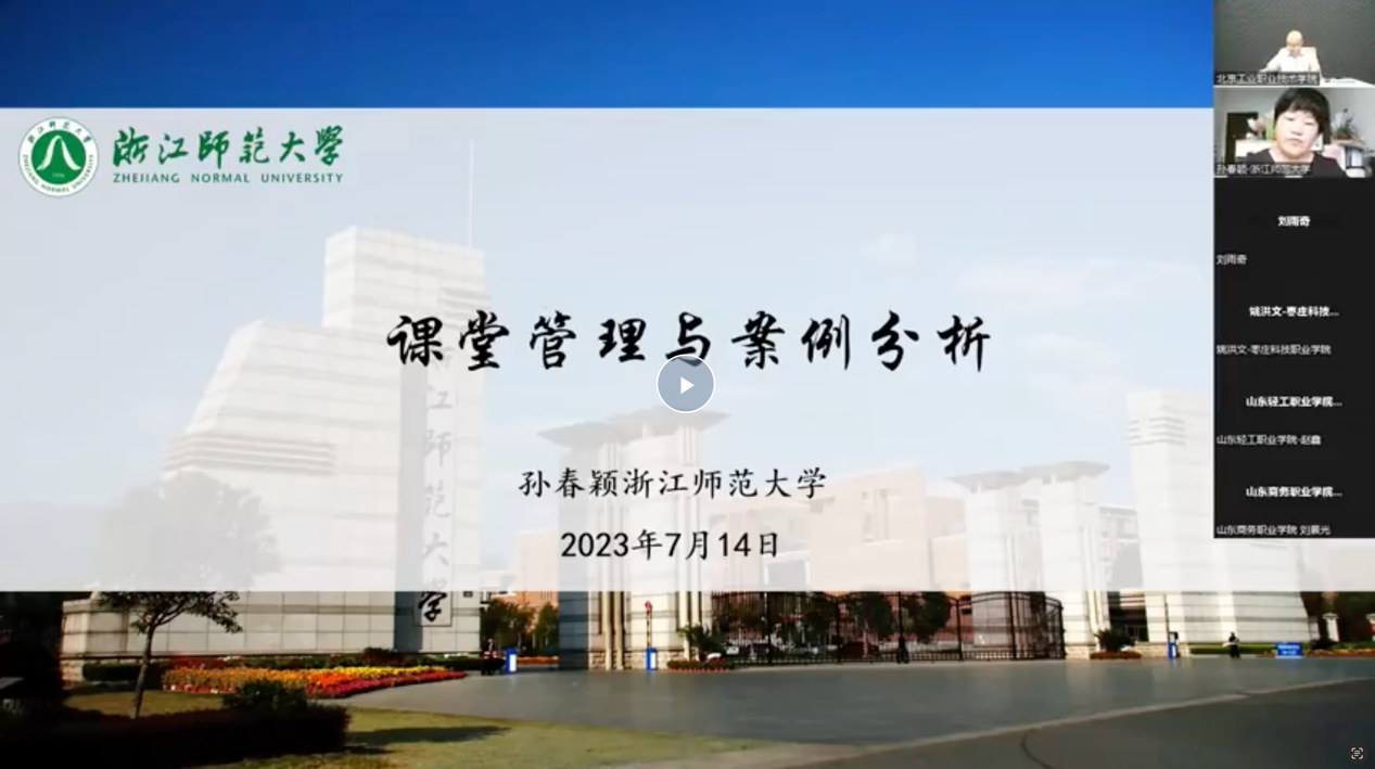 浙江師范大學(xué)國際文化與社會發(fā)展學(xué)院的孫春穎副教授的培訓(xùn)內(nèi)容為課堂管理與案例分析,通過幫助學(xué)員明確中文課堂管理的目標(biāo)和原則,對教師課堂管理領(lǐng)導(dǎo)方式和課堂管理等實際案例來提高國際中文教師對課堂管理,課程設(shè)計形式以及 “中文+職業(yè)技能”教育教學(xué)發(fā)展的新思路。