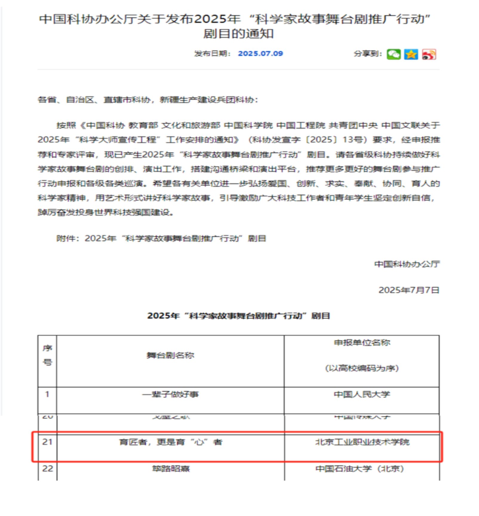7月9日,中國科學技術協會公布2025年“科學家故事舞臺劇推廣行動”劇目名單,我校原創舞臺劇《育匠者,更是育“心”者》成功入選。