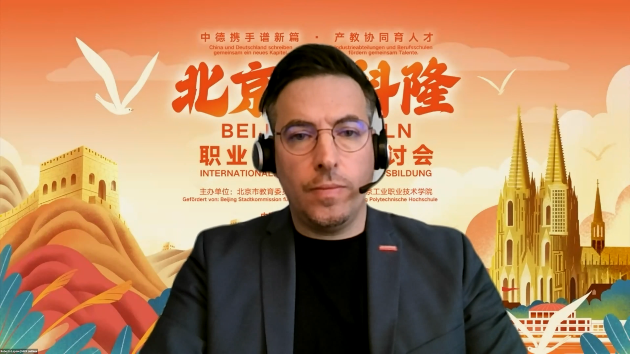 北京市教育委員會副主任孫其軍發表講話。他表示,兩個友城之間的教育交流與合作在過去35年深入發展,在師生流動、語言教學、人才培養、職教培訓等領域取得豐碩成果。他強調,科隆市作為德國第四大城市,歷史悠久、底蘊深厚,在職業教育方面有許多值得我們借鑒的經驗。希望未來以北京工業職業技術學院為代表的北京優秀職業院校,能夠在課程標準、師生互派、語言教學、國際會議、來華留學等方面進一步加強與科隆的交流與合作。相信以本次研討會為起點,必將開啟兩市未來務實高效合作的新篇章,產教融合、攜手共育更多的高素質國際化技術技能人才。