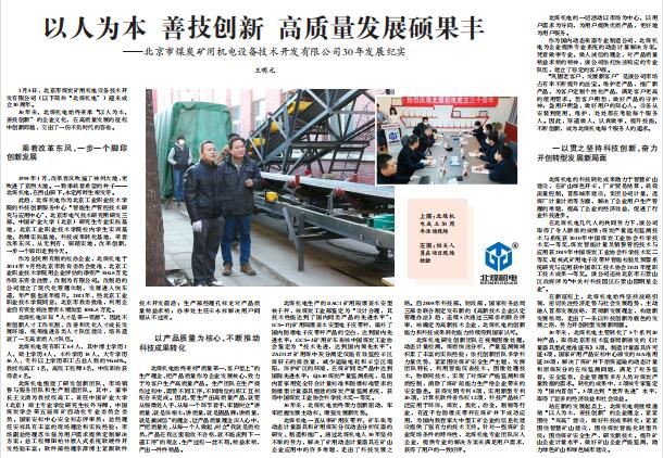 2023年1月5日,學院校辦企業——北京市煤炭礦用機電設備技術開發有限公司(“北煤機電”)舉辦了成立三十周年主題慶典活動。為全方位展示公司的發展歷程及取得成就,1月10日,《中國煤炭報》在第4版黨建專刊,以《以人為本 善技創新 高質量發展碩果豐——北京市煤炭礦用機電設備技術開發有限公司30年發展紀實》為題,從“乘著改革東風,一步一個腳印創新發展”“以產品質量為核心,不斷推動科技成果轉化”“一以貫之堅持科技創新,奮力開創轉型發展新局面”三個方面,深入系統地報道了公司秉承“以人為本、善技創新”的企業文化,在高質量發展的征程中創新跨越,交出了一份不負時代的答卷。