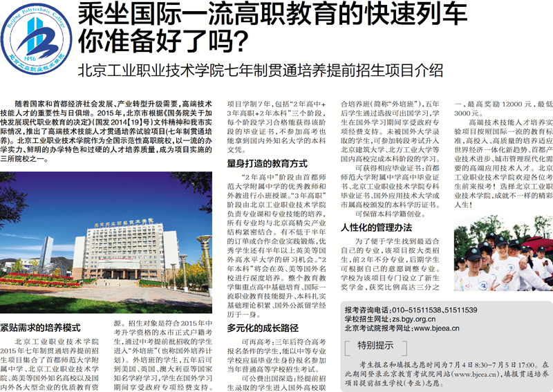 7月1日,《北京晚報》在47版刊登“乘坐國際一流高職教育的快速列車,你準備好了嗎?——北京工業職業技術學院七年制貫通培養提前招生項目介紹”文章,全文如下: