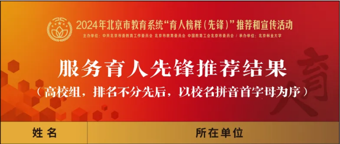 2024年北京市教育系統“育人榜樣(先鋒)”推薦和宣傳活動由中共北京市委教育工委、北京市教育委員會、北京市教育工會聯合開展。在學校黨委的統一部署下,我校開展了校級“育人先鋒”評選及北京市教育系統“育人榜樣(先鋒)”推薦工作。經相關程序,共評選出校級“育人先鋒”18人,并從其中推薦老師參評北京市教育系統“育人榜樣(先鋒)”。經過評比,最終我校6人榮獲北京市教育系統“育人先鋒”,這是我校“全員育人、全程育人、全方位育人”的生動實踐和重要成效。