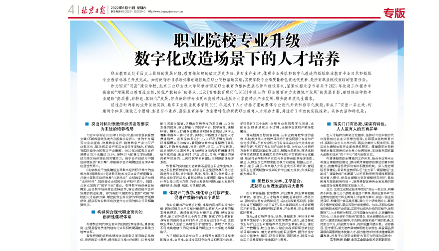 6月11日,北京日報刊登我校黨委常委、副院長劉蘭明教授署名文章《職業院校專業升級數字化改造場景下的人才培養》。文章介紹了我校作為國家“雙高”建設學校,推進學校專業建設“高質量、有特色的、國際化”發展,努力使所學專業更加精準地服務北京高精尖產業發展、服務高品質民生需求所作的實踐探索。