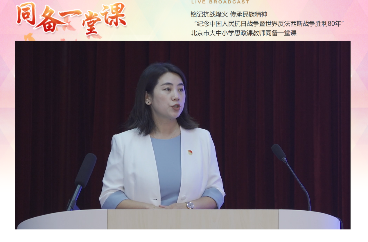 9月23日上午,由中共北京市委教育工作委員會主辦的北京市大中小學思政課教師“紀念中國人民抗日戰爭暨世界反法西斯戰爭勝利80周年”同備一堂課活動,在石景山區景山學校遠洋分校(東校區)報告廳隆重舉行。我校思政部教師李楊作為高職院校優秀教師代表,在活動中進行了匯報展示。她憑借精準的學情把握、創新的教學設計和生動的現場表達,贏得了現場專家與線上教師的一致好評。