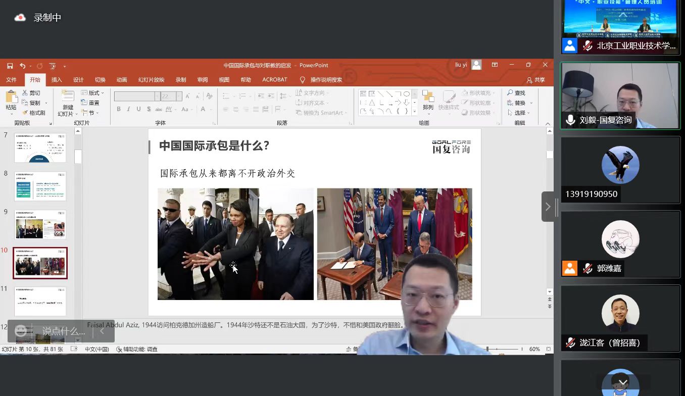 國復咨詢執行董事劉毅博士作了題為“中國國際工程發展趨勢與職業教育的啟發”的主題報告。劉毅博士從中國國際承包的內涵定義出發,闡述了中國國際工程承包行業的發展歷程并結合當前國際形勢和行業發展趨勢為職業教育發展提供了發展思路和建議。他提到,職業教育迎來大好發展時機,各職業院校應從被動輔助式的角色轉變成主動新型校企合作關系主體,堅持共商、共建、共享,推進校企深度合作發展。