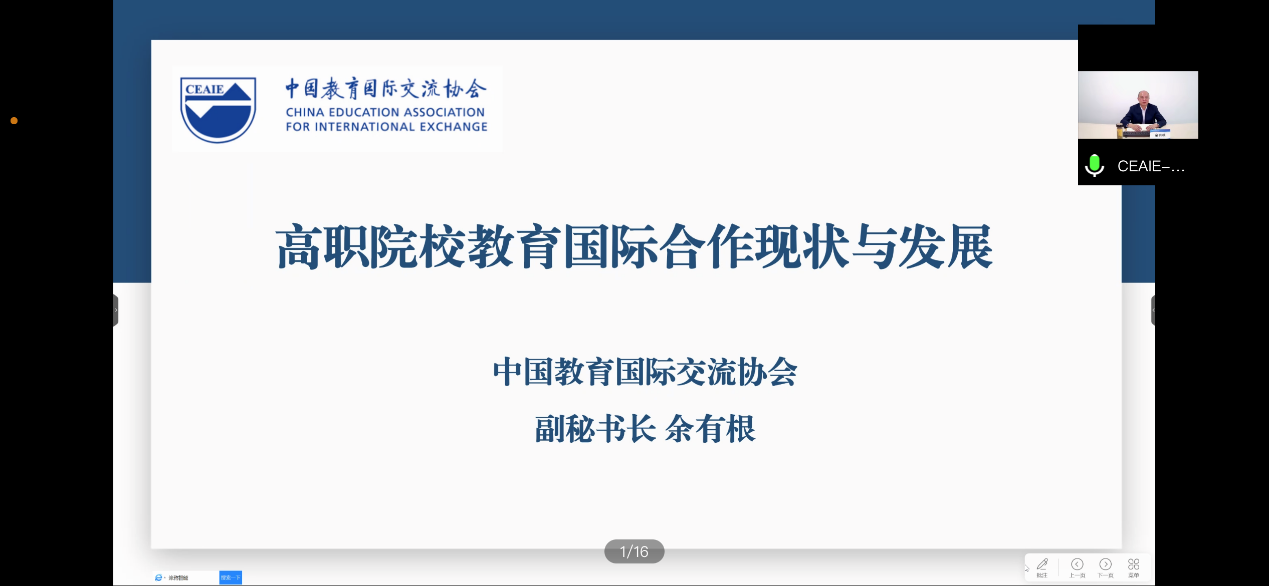 中國教育國際交流協會副秘書長余有根作了“高職院校教育國際合作現狀與發展”的報告。余有根副秘書長以一段精彩的視頻開始,圍繞職業教育改革發展政策紅利、職業教育改革成果、高職院校對外合作現狀與挑戰、職業教育對外開發建設內容以及職業教育對外開放實施路徑進行探討。他表示,希望各職業院校做好師資儲備,促進中外院校專業及課程對接,以需求為導向,柔性輸出中國職教理念。
