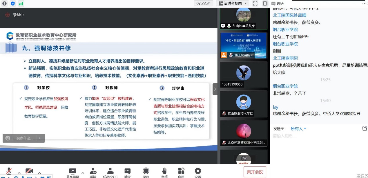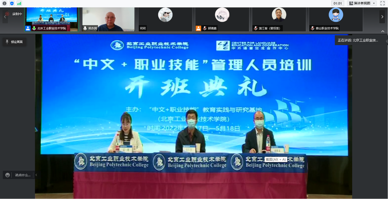 為貫徹落實中共中央辦公廳、國務院辦公廳印發《關于推動現代職業教育高質量發展的意見》,推動國際中文教育與職業教育“走出去”融合發展,構建“中文+職業技能”教育高質量發展新體系,5月17日至18日,北京工業職業技術學院“中文+職業技能”教育實踐與研究基地舉辦了“中文+職業技能”管理人員線上培訓,來自全國各地87所職業院校的262名校領導、國際處室負責人和教師參加了培訓。