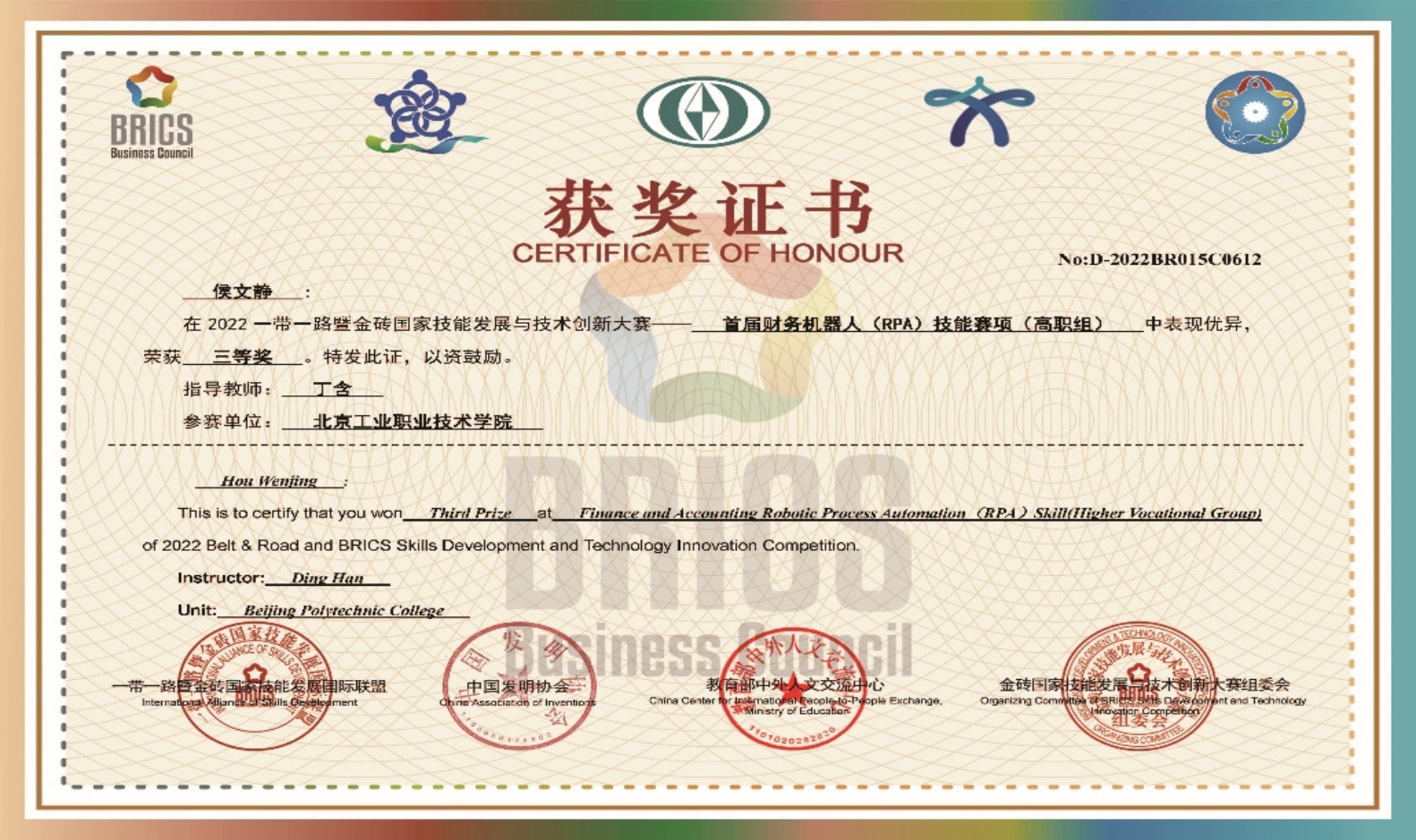 近日,由2022年金磚國家技能發展與創新大賽組委會、一帶一路暨金磚國家技能發展國際聯盟主辦的兩項大賽頒發獲獎證書,我校大數據與會計專業師生在該賽項中取得優異成績。