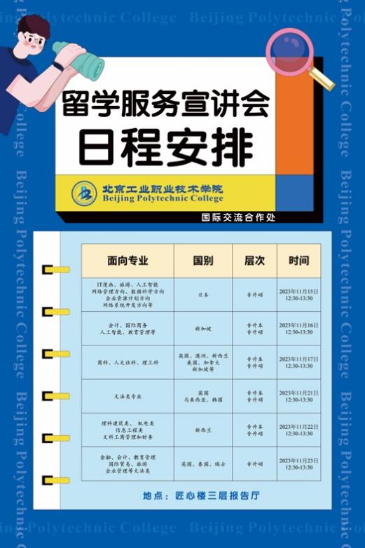 為服務全校學生,助力學生就業(yè)升學,提供更多留學深造的選擇和途徑,國際交流合作處于2023年11月15日至23日舉辦系列海外留學宣講會,宣講會共分六場,分別針對不同專業(yè),不同國別進行宣講,吸引各學院師生到場聆聽。