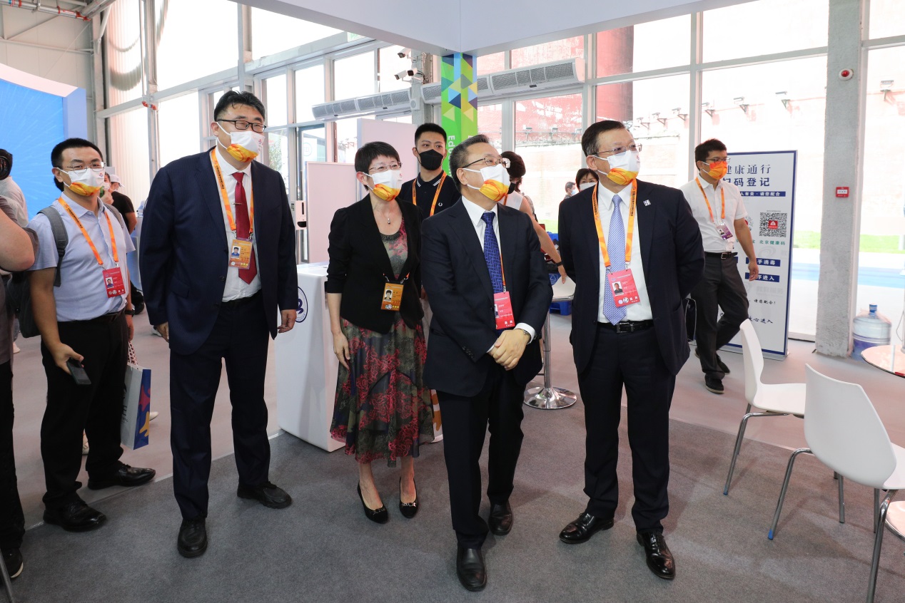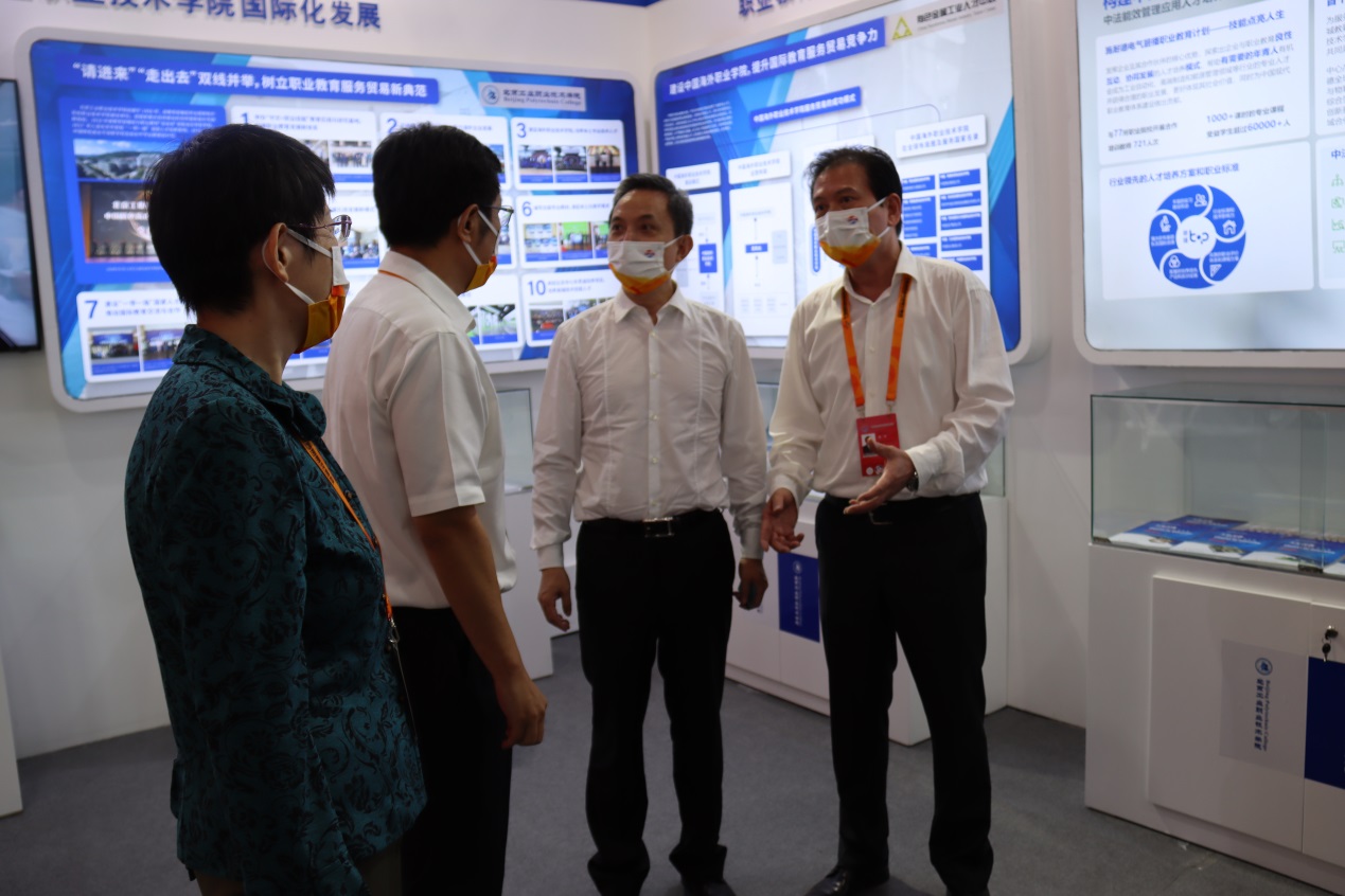 有色金屬工業人才中心副主任宋凱,施耐德電氣(中國)有限公司公共事務總監許屾、教育事務總監梁健等到服貿會現場支持我校參展工作