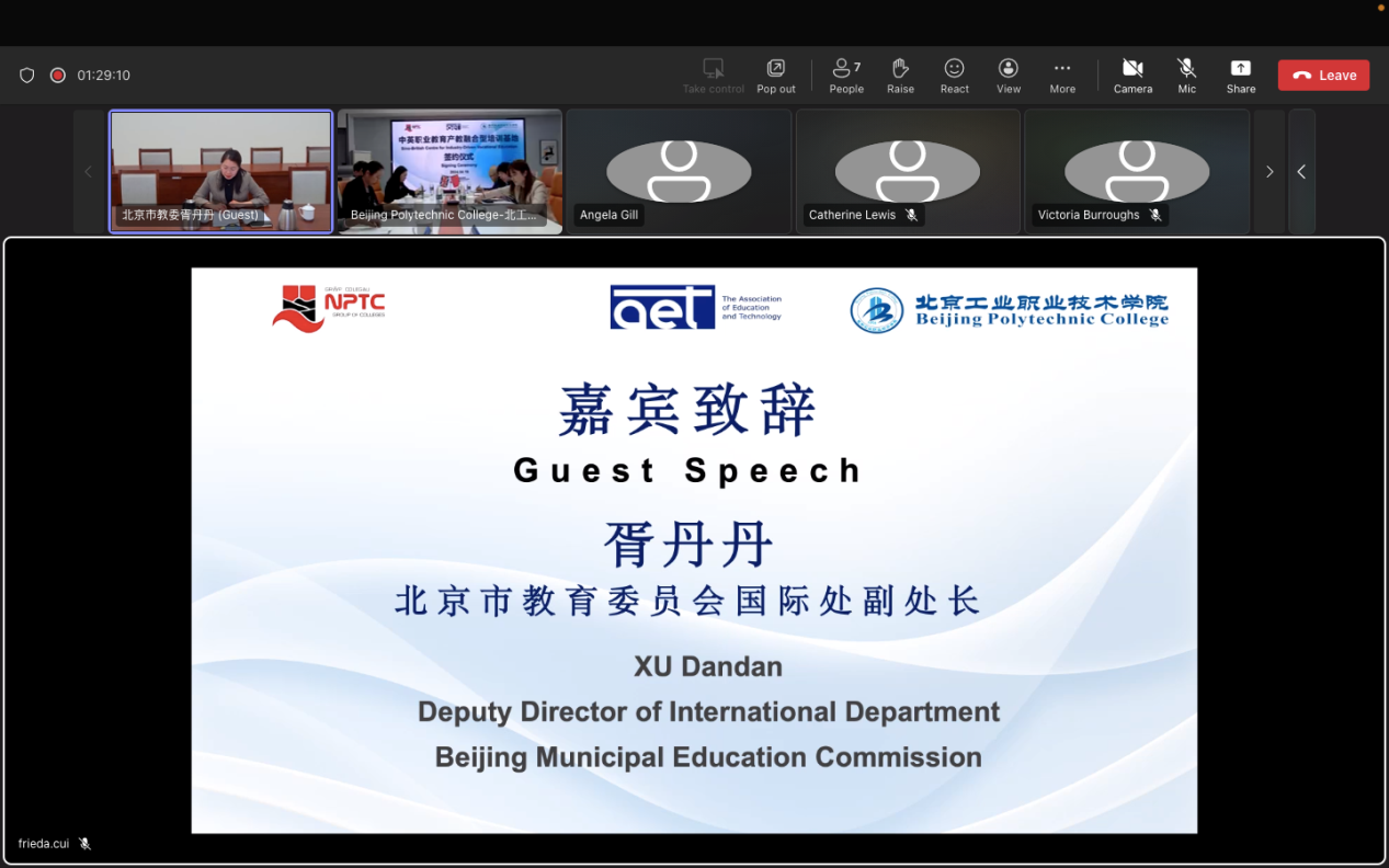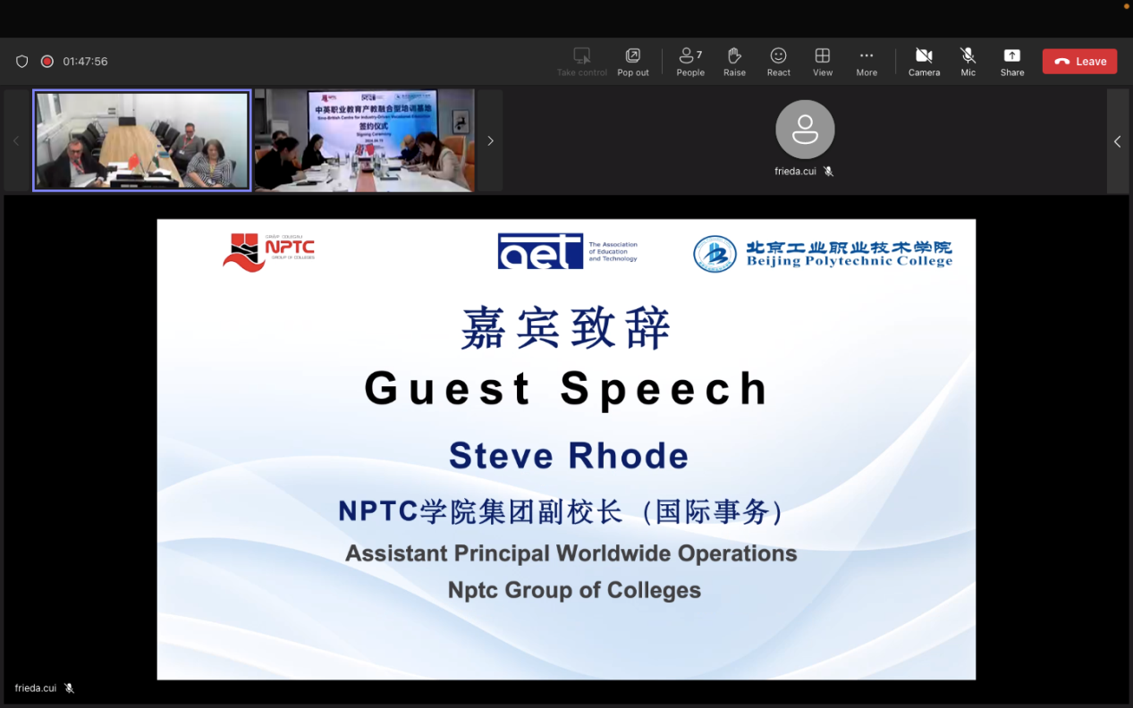 NPTC學院集團代表Steve Rhodes 線上出席會議并做發表講話。NPTC是英國最著名的職業學院之一,多年來,我們與中國多所學院溝通交流,并開展千名職業教師項目,幫助其實現從教室、工廠和培訓基地到以行業驅動的職業教育轉型,彌補勞動力技能差距,從而支持中國經濟發展,讓學生具有實用技能和深入理解最新行業實踐的高素質從業者。