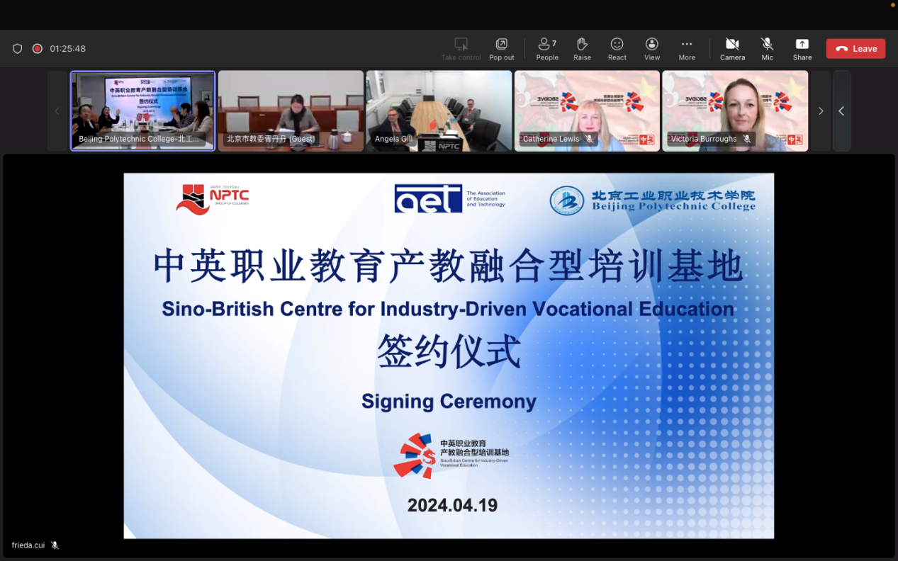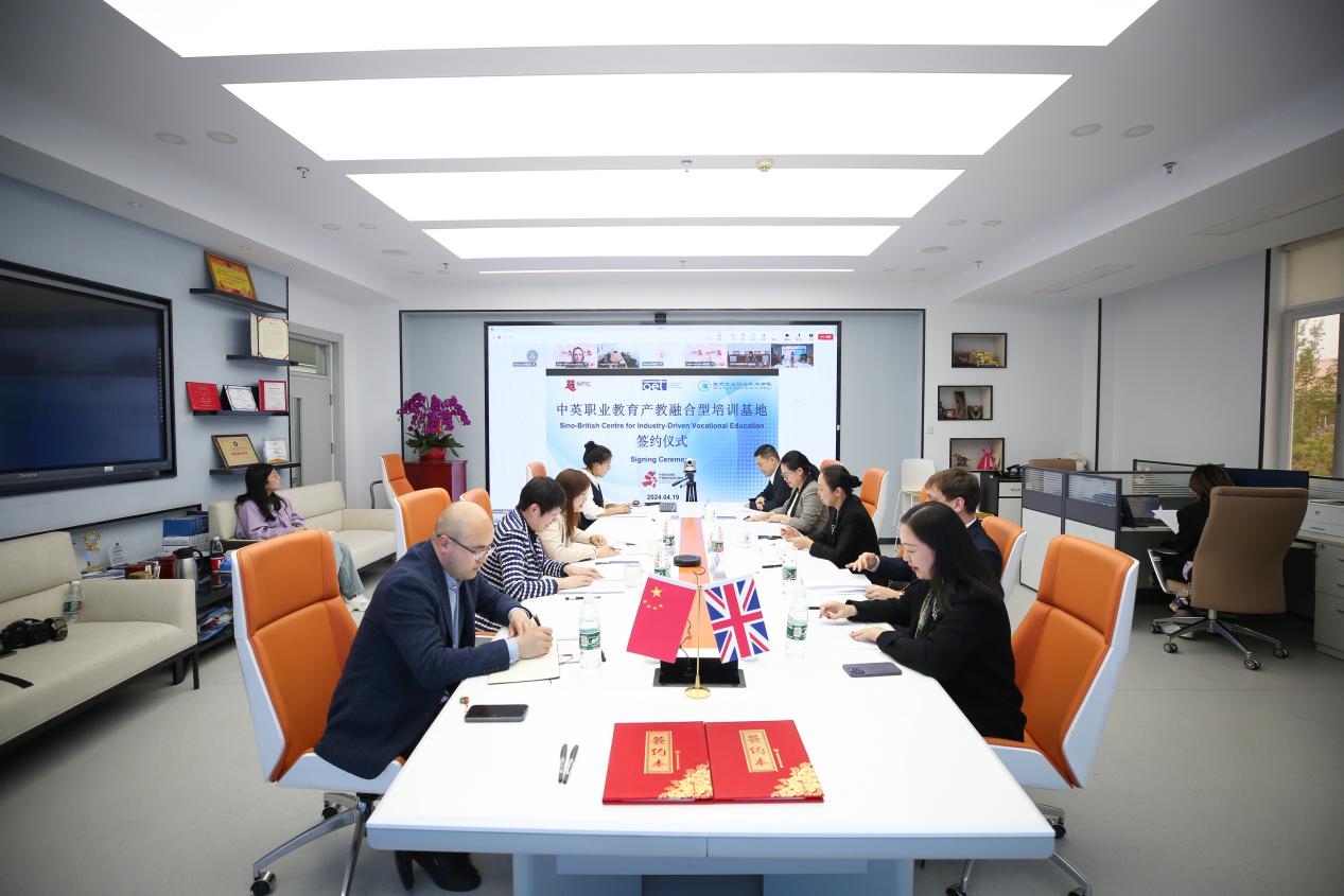 4月19日,在北京市教育委員會、英國威爾士政府的共同見證下,我校與英國教育科技協會、英國NPTC學院集團三方共同舉辦了“中英職業教育產教融合型培訓基地”簽約儀式。北京市教委國際合作與交流處副處長胥丹丹線上出席本次簽約儀式,英國威爾士政府代表Susan Jiang、英國教育科技協會副主席Dr. Cas Widdershoven、英國教育科技協會中國區執行主席武印霞線下出席簽約儀式,英國NPTC學院集團總校長兼集團CEO Catherine Lewis、分管高等教育副校長Vicky Burroughs、主管國際事務副校長Steve Rhodes、國際事務學術部總負責Christopher Manley線上出席會議,我校黨委常委、副院長周燕、國際交流合作處處長孟晴、副處長謝麗杲以及相關工作人員一同出席簽約儀式。會議由國際處處長孟晴主持。