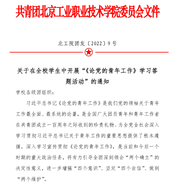 校團委在全校學生中開展了“《論黨的青年工作》學習答題活動”,通過中國青年報答題平臺,與全國職業院校學生一起學習黨的領袖關于青年工作最全面、最系統的論著。各團支部開展“爭做模范帶頭綻放美麗青春”主題團日活動,深入學習習近平總書記在慶祝中國共產主義青年團成立100周年大會上的重要講話精神,通過冬奧志愿者、疫情防控志愿者等身邊榜樣的故事宣講,引領廣大團員青年落實新時代共青團員“五個模范、五個帶頭”的要求。