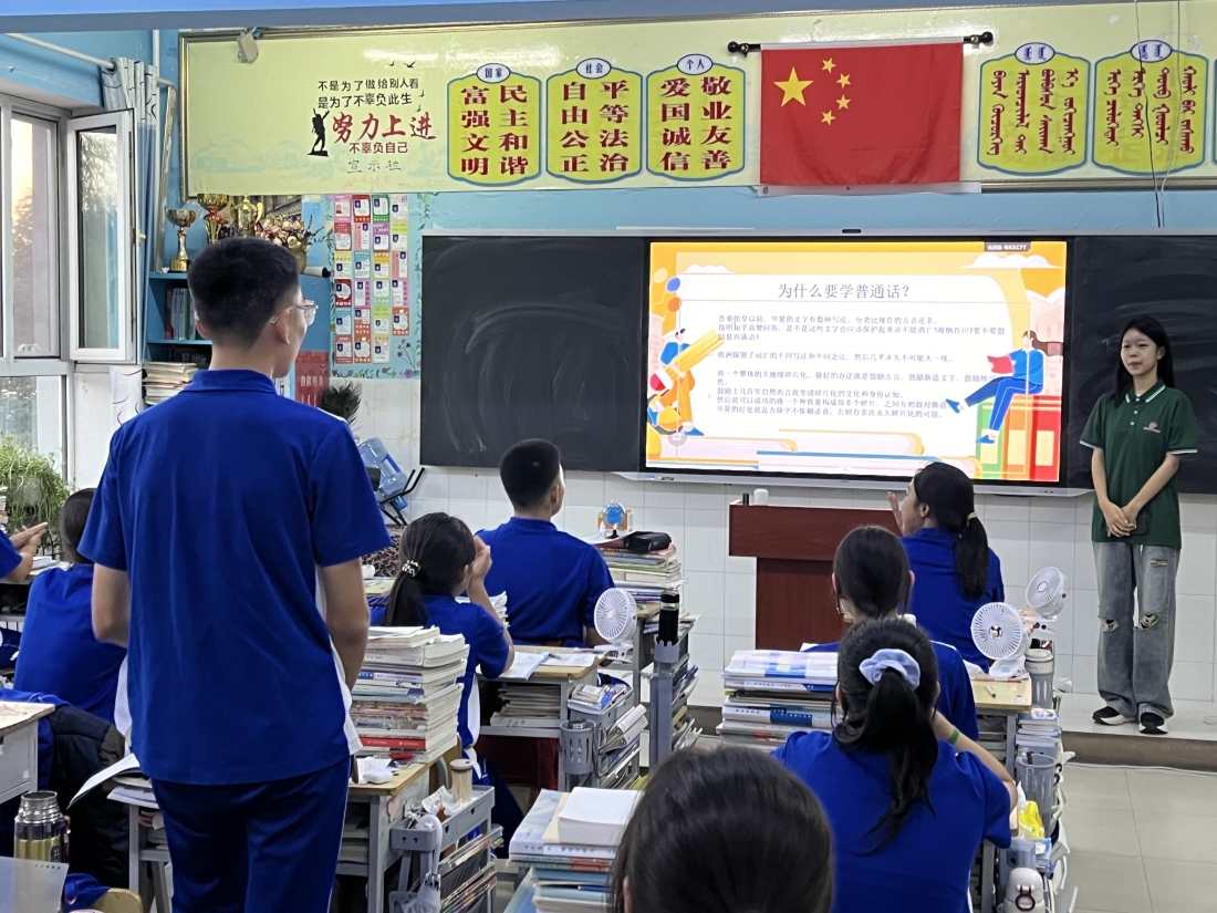 本次社會實踐活動得到了北京市語言文字工作委員會的指導和北京工業職業技術學院校團委的大力支持,本次社會實踐活動由基礎教育學院葛東雷老師帶隊。社會實踐服務隊師生分別到巴彥查干嘎查、天山二中、內蒙古高格斯臺罕烏拉國家級自然保護區開展推廣普通話活動,服務隊深入到農牧民家中,宣傳講好普通話的重要意義,為學生講解漢語拼音聲調,帶領學生練習普通話,寫規范字。本次活動圍繞“共講一段話、共讀一本書、共誦一首詩、共唱一首歌、共畫一幅畫”開展相關活動。