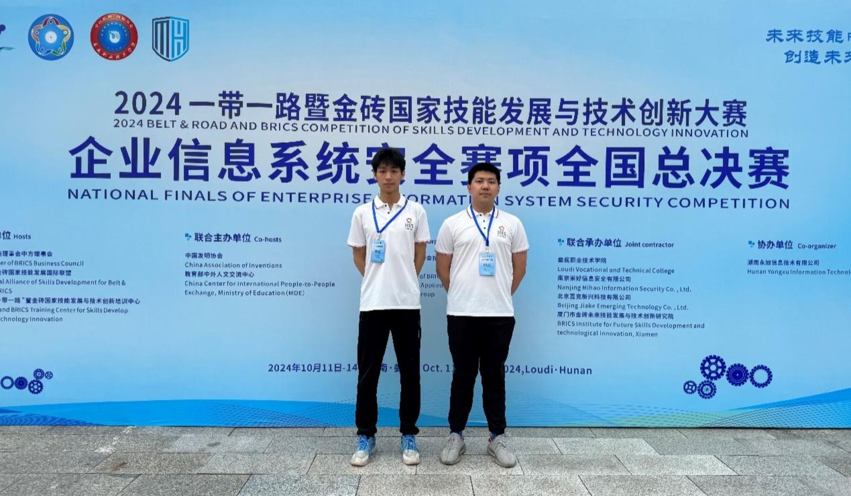10月13日,2024一帶一路暨金磚國家技能發展與技術創新大賽之企業信息系統安全賽項全國總決賽在婁底職業技術學院舉行。在這場匯聚了全國職業院校精英的激烈角逐中,我校信息工程學院的參賽選手在84支隊伍中脫穎而出,其中網絡1971班的李志鑫、劉金碩同學位列第16名,榮獲全國二等獎(銀牌),我校榮獲優秀組織獎。