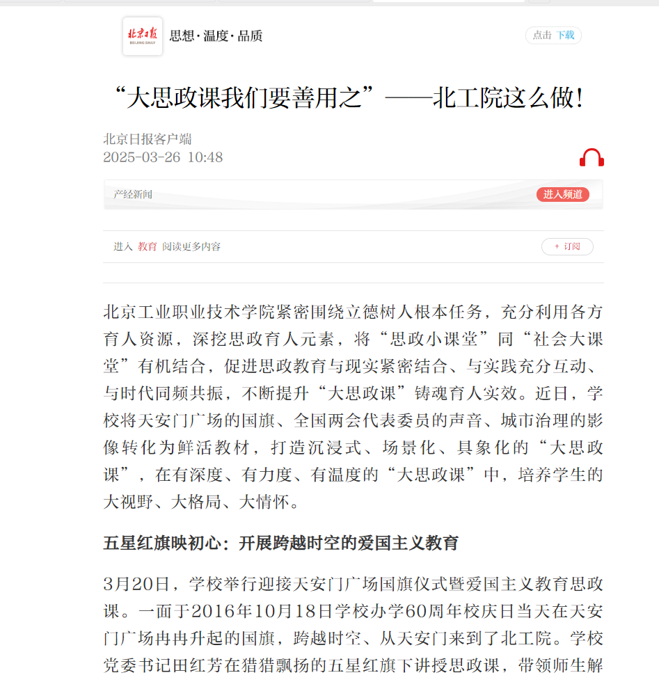 2025 年 3 月 6 日,習近平總書記在看望參加全國政協會議的民盟、民進、教育界委員時強調:“要堅持思政課建設和黨的創新理論武裝同步推進、思政課程和課程思政同向同行”“把思政教育‘小課堂’和社會‘大課堂’有效融合起來”。北京工業職業技術學院深入貫徹習近平總書記對學校思政課建設的重要指示精神,積極探索契合職業院校學生認知特點的 “大思政課” 綜合改革。近期,學校別出心裁地將天安門廣場的國旗、熱血出征的戎裝、“兩會”代表的聲音、城市治理的影像轉化為生動教材,打造沉浸式、場景化、具象化的 “大思政” 課堂,這一創新實踐成果引發中國青年報、北京日報、中國教育在線、學習強國等主流媒體的集中報道。現將相關報道全文轉載如下: