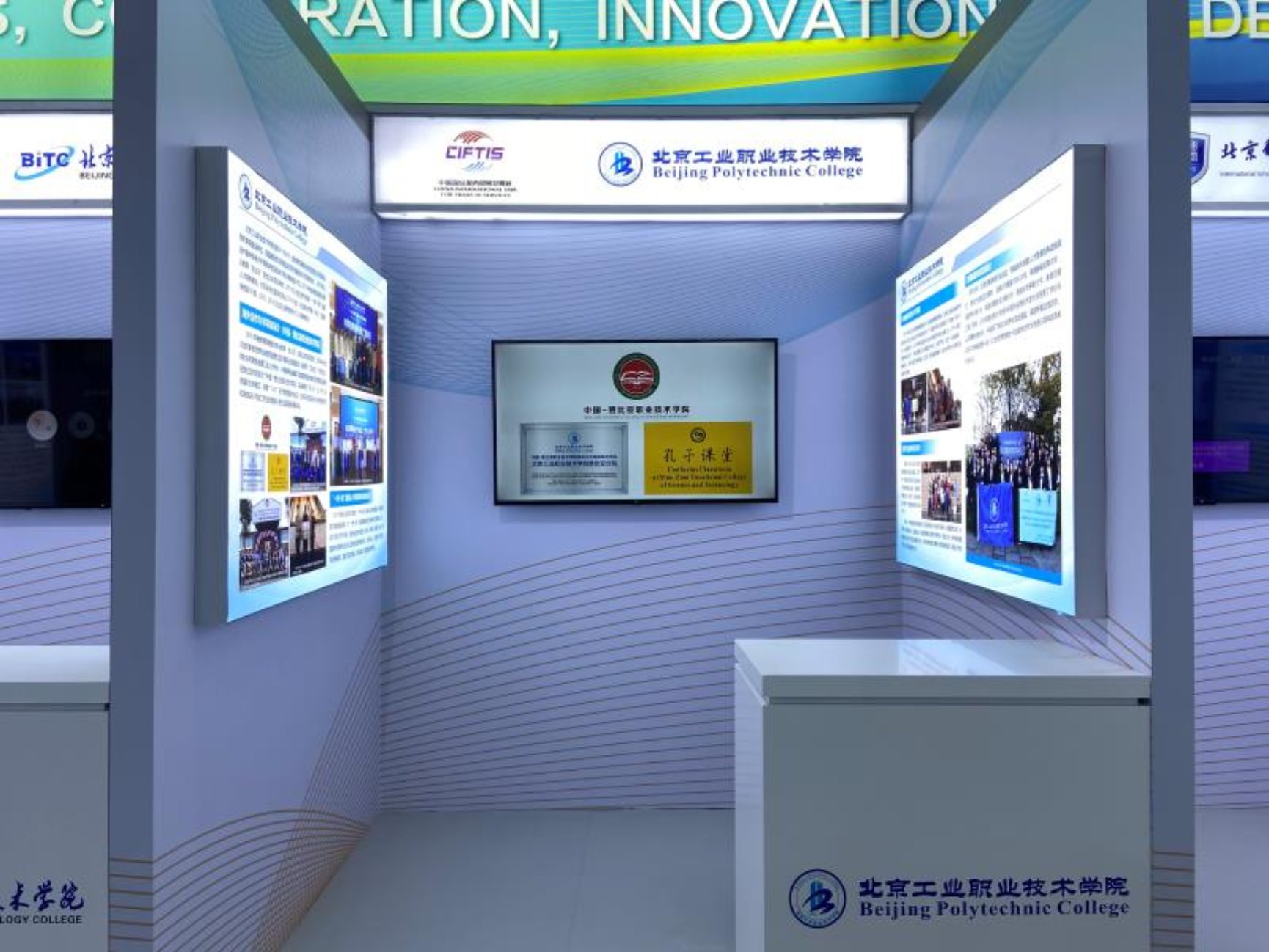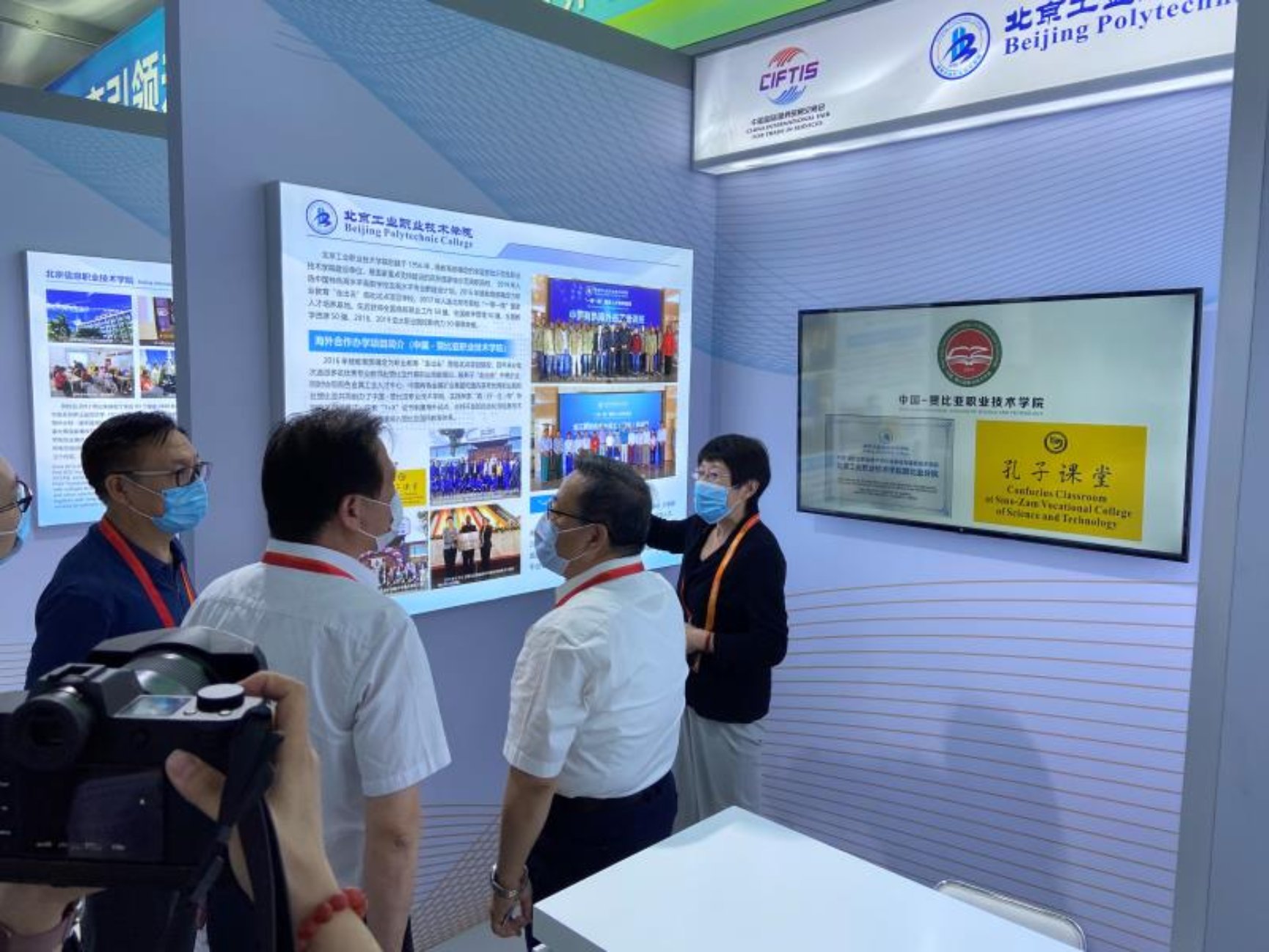9月2日下午,北京市教育委員會主任劉宇輝、副主任黃侃一行來到我校展臺檢查指導。周燕副校長現場向市教委領導介紹了我校線下展出主要內容以及布展籌備情況。市教委領導對我校在職業教育“走出去”、海外合作辦學和服務國家“一帶一路”發展等方面所做的工作給予了充分肯定,并對我校積極參與服貿會及籌備工作給予了高度認可。