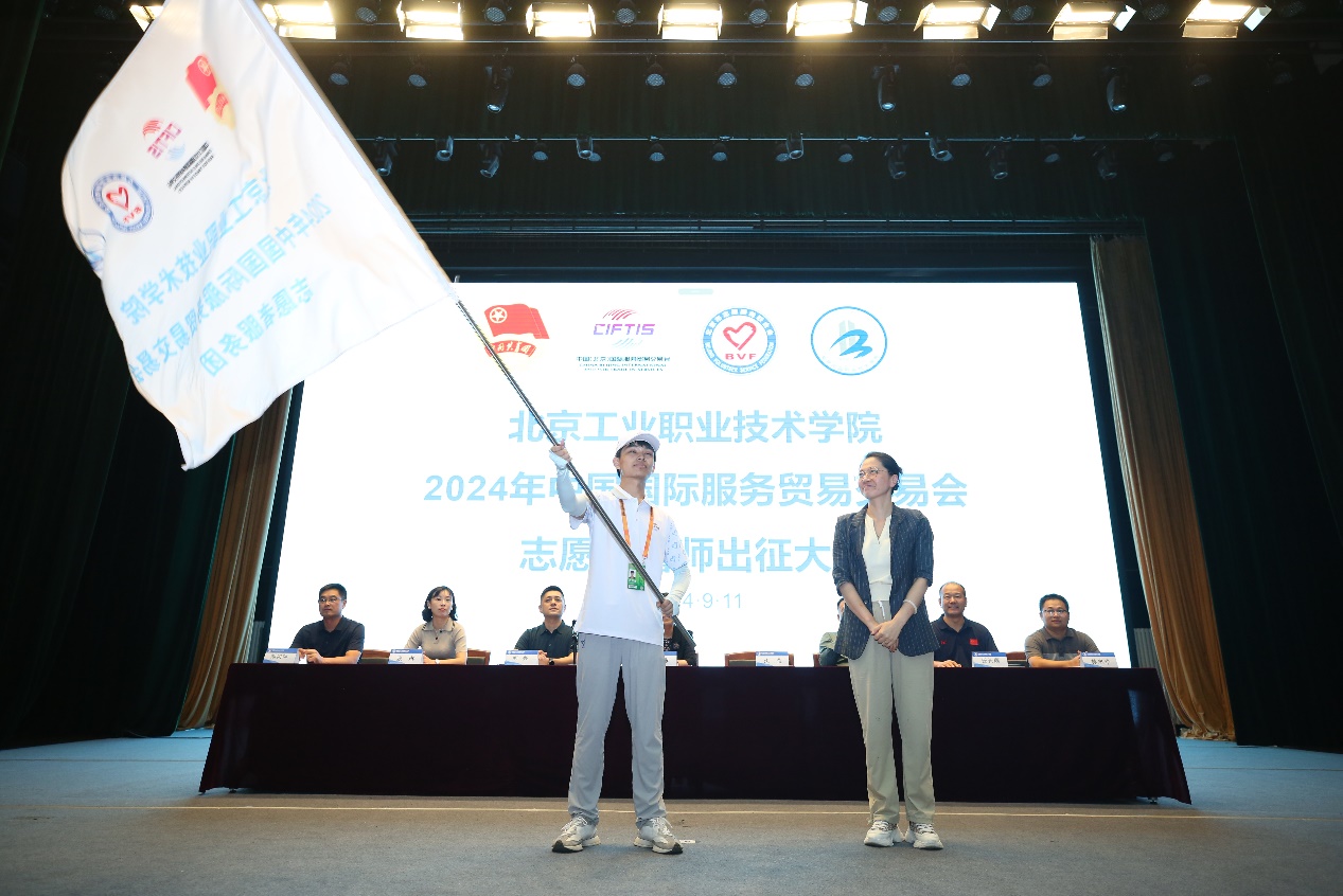 9月11日,2024年中國國際服務貿易交易大會志愿者誓師出征大會在我校禮堂召開。黨委常委、副院長周燕為同學們做動員講話,她代表學校黨委對即將投身服貿會志愿服務工作的志愿者們表示敬意和感謝,希望同學們能夠以高度的責任感和使命感投入到工作中,發揚好團隊精神,在服貿會的舞臺上展現出我們北工院志愿者的風采,讓世界看到中國青年的擔當與活力!黨委常委、副院長沈瑩為志愿服務團授旗。
