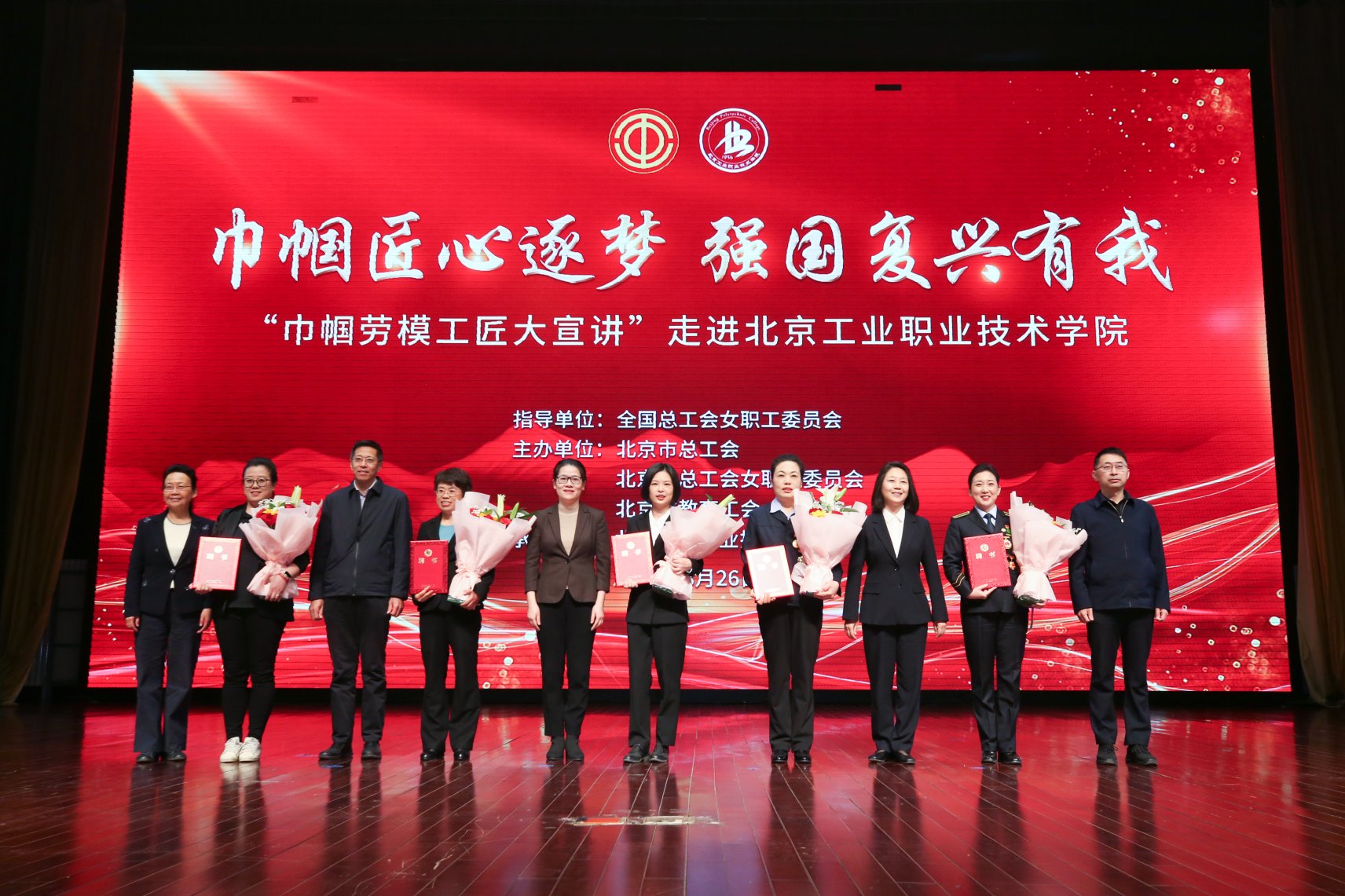 3月26日,由全國總工會女職工委員會指導(dǎo),北京市總工會、北京市總工會女職工委員會、北京市教育工會共同主辦,北京工業(yè)職業(yè)技術(shù)學(xué)院承辦的“巾幗匠心逐夢 強國復(fù)興有我——巾幗勞模工匠大宣講”活動在我校隆重舉行。五位巾幗勞模工匠代表動情講述了她們詮釋勞模精神、勞動精神、工匠精神的奮斗故事,引得全場觀眾用熱烈掌聲向她們致敬。中華全國總工會女職工部副部長洪莎,北京市總工會黨組成員、副主席趙麗君,北京市教育工會主席宋麗靜,中華全國總工會女職工部權(quán)益一處處長徐建紅,北京市總工會女職工部部長張洋,我校黨委書記高喜軍,黨委副書記、院長柳長安,黨委副書記魏曉東,黨委常委、副院長高世吉出席活動。學(xué)校600余名師生現(xiàn)場聆聽這一堂“大思政課”。