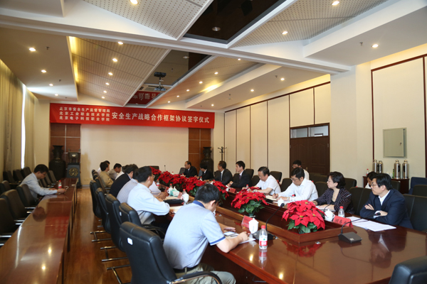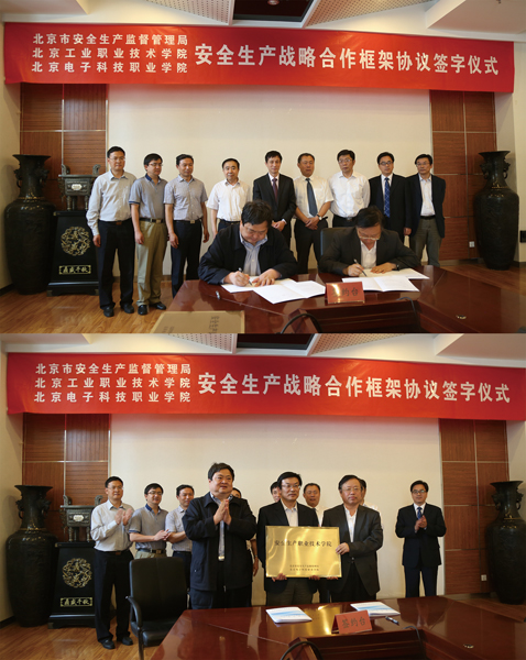 市安監局黨組書記、局長張樹森與北京工業職業技術學院陳建民校長簽署戰略合作框架協議;并共同為“安全生產職業技術學院”頒牌。