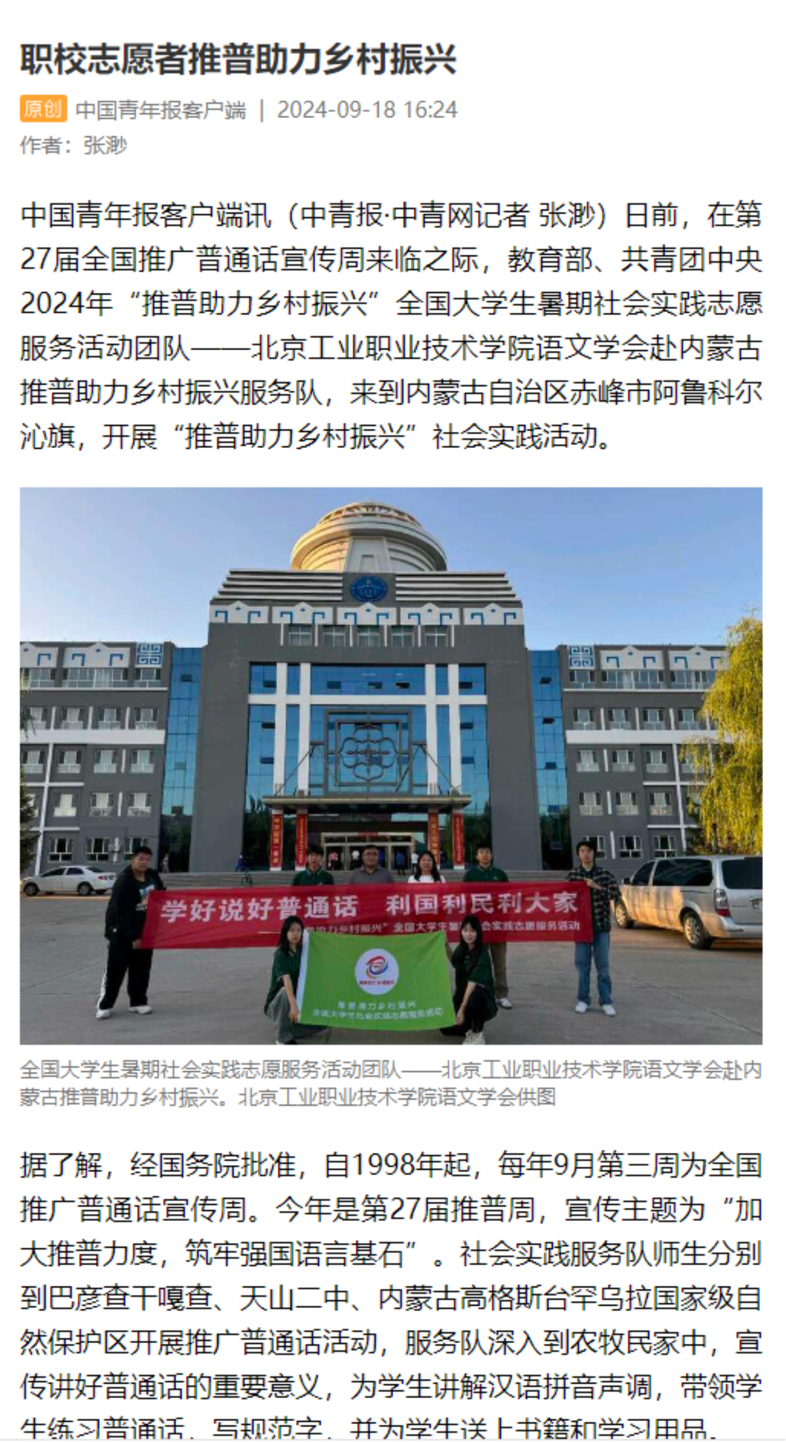 語文學會已連續三年獲批教育部、團中央“推普助力鄉村振興”全國大學生暑期社會實踐志愿服務活動團隊,此項指標為首輪“雙高”校驗收指標,我校也是三年來北京市唯一獲批此項目的高職院校。2024年實踐團隊赴內蒙古自治區赤峰市阿魯科爾沁旗牧區和學校開展推普活動,活動圍繞“共講一段話、共讀一本書、共誦一首詩、共唱一首歌、共畫一幅畫”開展相關活動,將語言之美與文化之韻、文字之美與音樂之情深度融合,加深少數民族地區對中華優秀傳統文化的深刻認識,鑄牢中華民族共同體意識,讓各民族的心更近,情更真,義更濃。本次社會實踐活動先后得到了《中國教育報》《中國青年報》《北京青年報》《現代教育報》的報道。