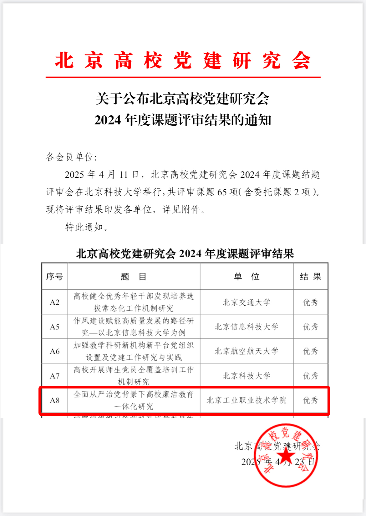 近日,北京高校黨建研究會 2024 年度課題結題評審會在北京科技大學舉行,共評審課題 65 項,其中優(yōu)秀項目17項(A類5項、B類7項、C類2項、Z類3項)。我校主持的《全面從嚴治黨背景下高校廉潔教育一體化研究》項目獲評A類課題優(yōu)秀。