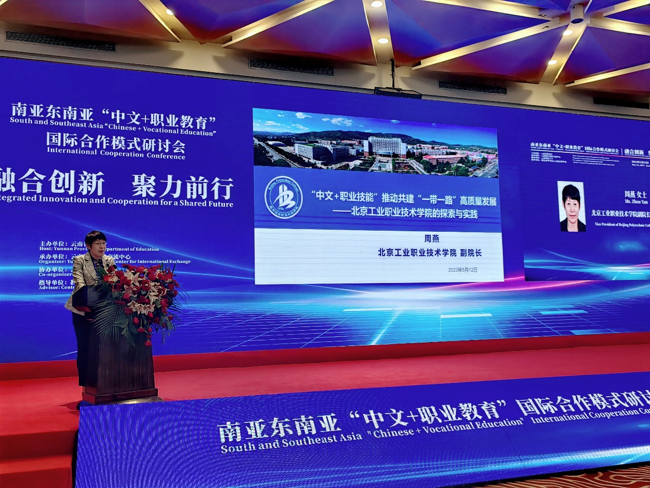 作為高職院校唯一代表,我校周燕副院長做了題為《“中文+職業技能”推動共建“一帶一路”高質量發展-北京工業職業技術學院的探索與實踐》主旨報告,從學校簡介及國際化辦學情況、職業教育“走出去”路徑創新、“中文+職業技能”實踐探索、“中文+職業教育”思考展望四個方面進行了精彩分享,為云南省各高校就面向南亞東南亞國家開展“中文+職業技能”教育以及職業教育“走出去”模式提供了可借鑒的經驗。
