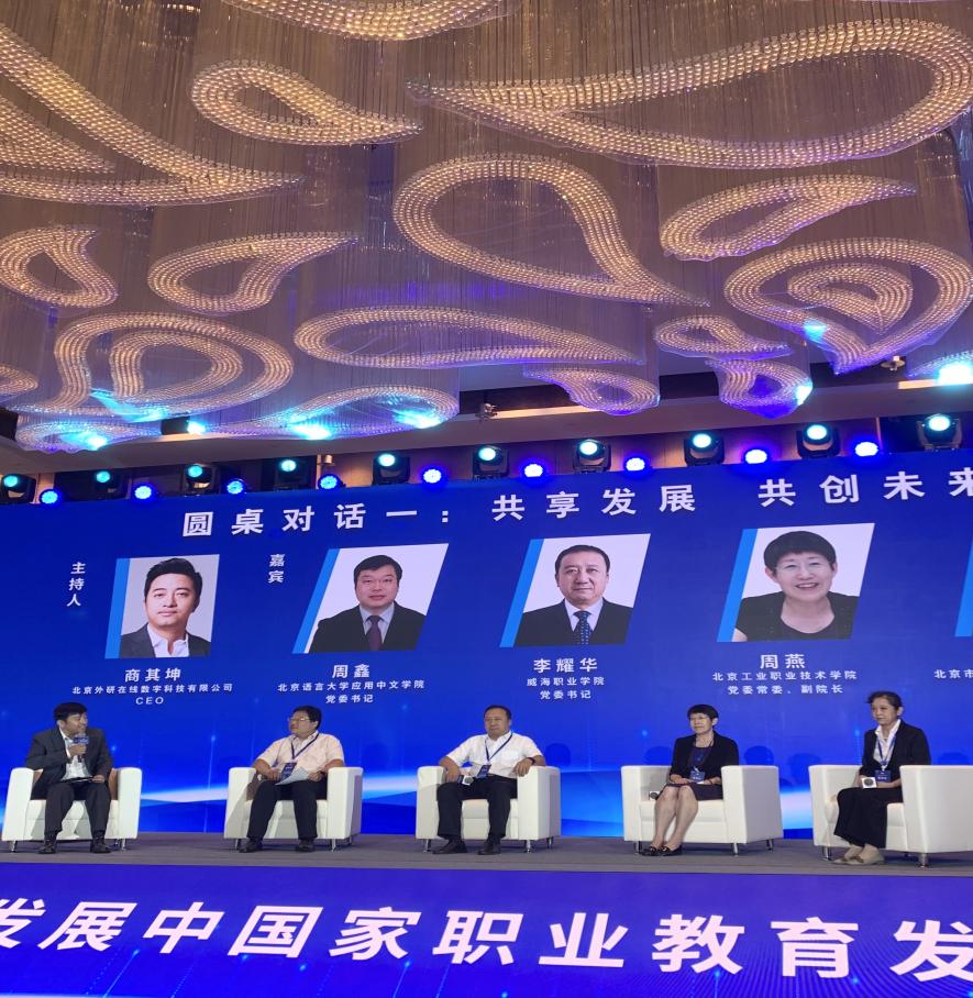 本次論壇還設置了圓桌對話環節。首場圓桌主題為“共享發展 共創未來”,由北京外研在線數字科技有限公司CEO商其坤主持,北京語言大學應用中文學院黨委書記周鑫、威海職業學院黨委書記李耀華、北京工業職業技術學院黨委常委、副院長周燕、北京市豐臺區職業教育中心學校副校長李毓榮參與。幾位嘉賓圍繞“一帶一路”倡議背景下,我國在職業教育領域積極開展對外合作成果展開了探討。