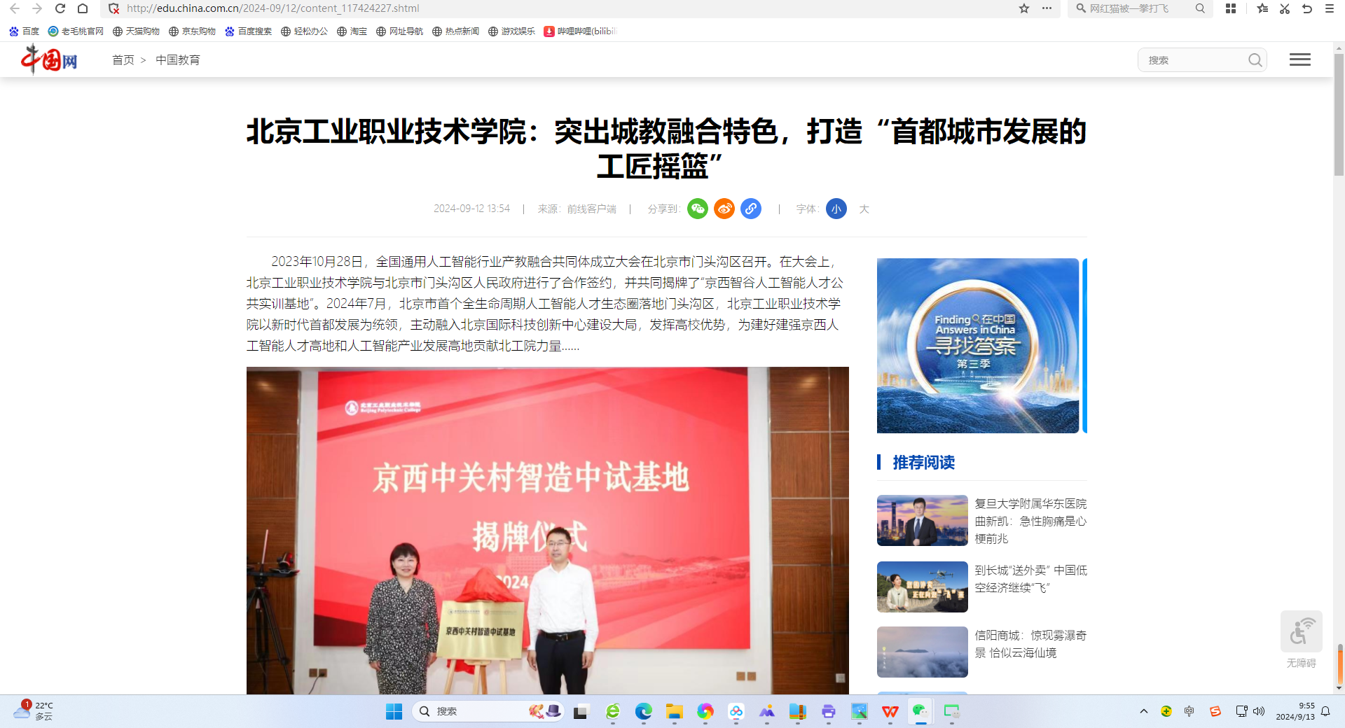 近日,市委教育工委聯合前線雜志社推出“北京高校服務新時代首都發展特別報道”,生動展現北京市屬高校發揮自身優勢服務首都城市發展建設的典型事跡和突出成績。9月12日,學校特別報道《北京工業職業技術學院:突出城教融合特色,打造“首都城市發展的工匠搖籃”》在前線客戶端發表,該報道同時被中國網、光明網、北京日報、現代教育報、學習強國、新浪網等主流媒體進行轉載。展現學校作為首都職業教育的“排頭兵”,以新時代首都發展為統領,緊緊圍繞首都城市戰略定位,突出“城教融合”辦學特色,致力于打造“首都城市發展的工匠搖籃”,取得的一系列標志性成果。