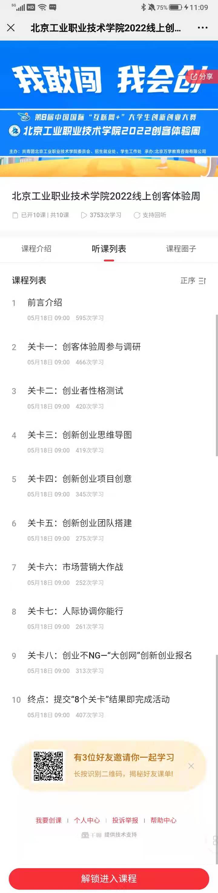 在訓(xùn)練營(yíng)開(kāi)營(yíng)期間植入了“我敢闖、我會(huì)創(chuàng)”主題“創(chuàng)客體驗(yàn)周”活動(dòng)。體驗(yàn)周活動(dòng)面向全校學(xué)生,采用線上的形式開(kāi)展。創(chuàng)業(yè)體驗(yàn)周是為培養(yǎng)學(xué)生的創(chuàng)新精神和創(chuàng)造能力而舉辦的創(chuàng)業(yè)體驗(yàn)活動(dòng),同學(xué)們完成所有體驗(yàn)活動(dòng)通關(guān)后能獲得創(chuàng)業(yè)體驗(yàn)周證書,同時(shí)獲得學(xué)校“第二課堂”學(xué)分。