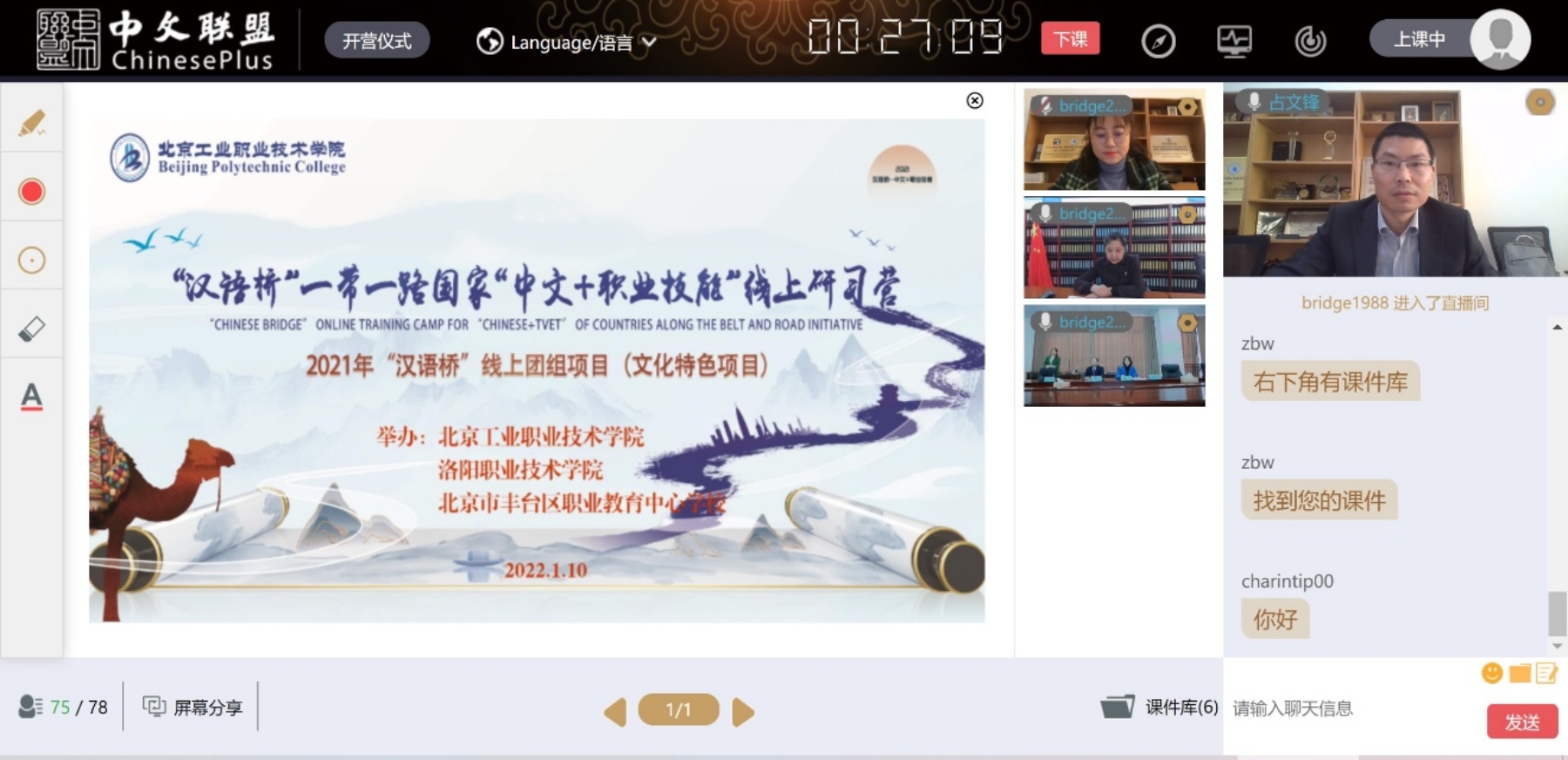 本次“漢語橋”特色項目由北京工業職業技術學院聯合洛陽職業技術學院、北京市豐臺區職業教育中心學校共同舉辦。三校圍繞“中文+職業技能”精心安排了2周28次國際中文、中國傳統文化和職業技能的直播和錄播課程。我校范薇老師以“走進‘雙奧城市’——北京”為題,開啟了第一講,隨后我校文法與管理學院張曼如、劉海英、李曉純、黃希等四位老師將在云端依次開講,為研習營的學員們奉上一場場精彩的文化饕餮盛宴。
