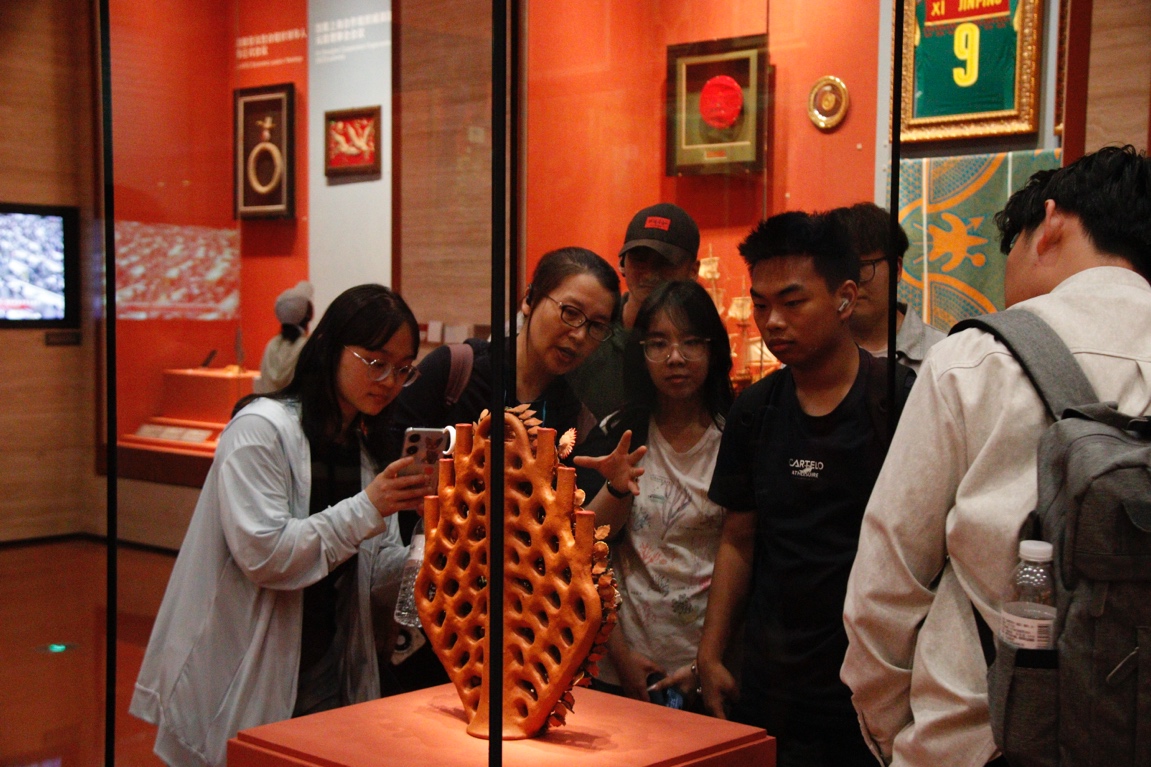 網絡技術 2331 班的張震說:“參觀過程中,我深切感受到中國外交的開放包容與合作共贏精神。在‘文明互鑒’專題區,那些融合了中西方藝術元素的定制禮品,生動詮釋著‘各美其美,美美與共’的外交智慧。這不僅是一場視覺盛宴,更是一堂生動的外交思政課。從青銅禮器到現代工藝精品,國禮的演變串聯起新中國的外交征程,讓我對我國的外交成就倍感自豪,也激勵我以更開闊的視野和更堅定的信念,為國家發展貢獻力量?!?/p>
