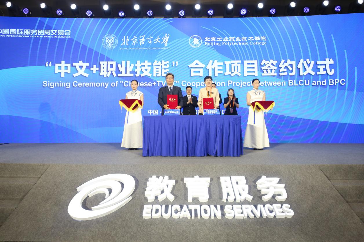 在教育部中外語言交流合作中心(以下簡稱“語合中心”)和北京市教育委員會(以下簡稱“市教委”)的大力支持下,我校與北京語言大學于服貿會開幕當天,在北京市教委舉辦的職業教育國際化專題活動上舉行“中文+職業技能”項目合作簽約儀式。教育部語合中心副主任胡志平發表致辭并見證了簽約。北京語言大學黨委常委、副校長張寶鈞和我校黨委常委、副院長周燕分別發言。北京市教委副主任孫其軍、我校黨委書記高喜軍、北京語言大學應用中文學院院長蘇英霞、我校國際處處長孟晴和與會百余所學校來賓一同見證了這一重要時刻。該項目是全國首例由語言類本科院校與高職院校共建的“中文+職業技能”深度融合項目,再創國際中文教育新模式。