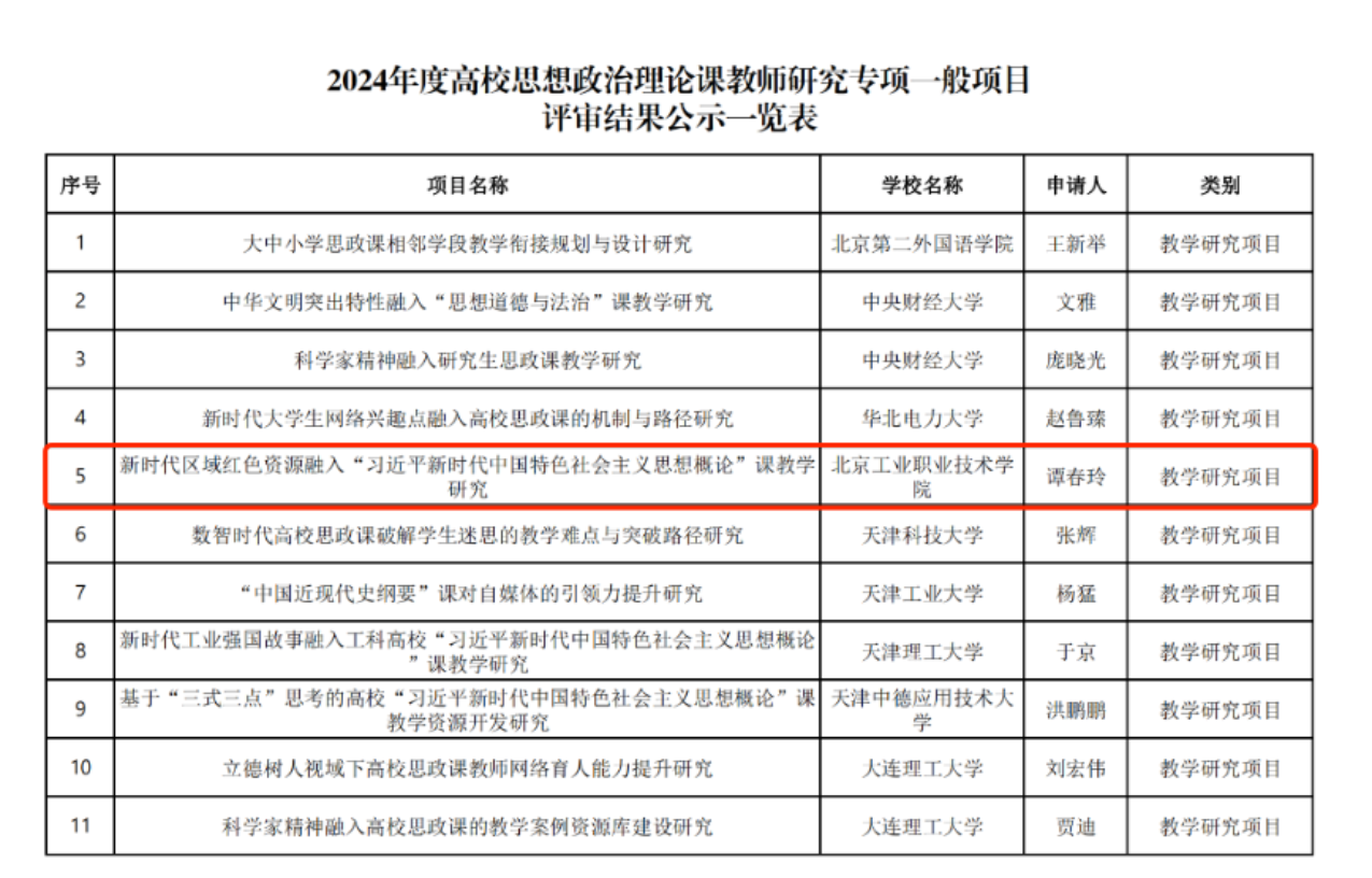 在全國所有高校中,本年度思想政治理論課教師研究專項(xiàng)一般項(xiàng)目共立項(xiàng)200項(xiàng),共有170所高校入選。本年度北京高校(含本科院校和職業(yè)高校)入選教育部2024年度高校思想政治理論課教師研究專項(xiàng)“教學(xué)研究項(xiàng)目”5項(xiàng),“教學(xué)方法改革擇優(yōu)推廣項(xiàng)目”1項(xiàng),“優(yōu)秀中青年思政課教師擇優(yōu)資助項(xiàng)目”2項(xiàng),“教學(xué)研究青年項(xiàng)目”4項(xiàng),共計(jì)11項(xiàng)。我校譚春玲老師主持的項(xiàng)目是北京市所有入選項(xiàng)目中唯一的職業(yè)院校項(xiàng)目,這充分展示了我校馬克思主義學(xué)院教師在思想政治理論課教學(xué)研究中的前瞻性思維和積極實(shí)踐探索成果,這將有力地提升我校馬院馬克思主義與思政課教學(xué)研究在全國高校中的影響力,并助力我校人文社科研究取得更高水平。
