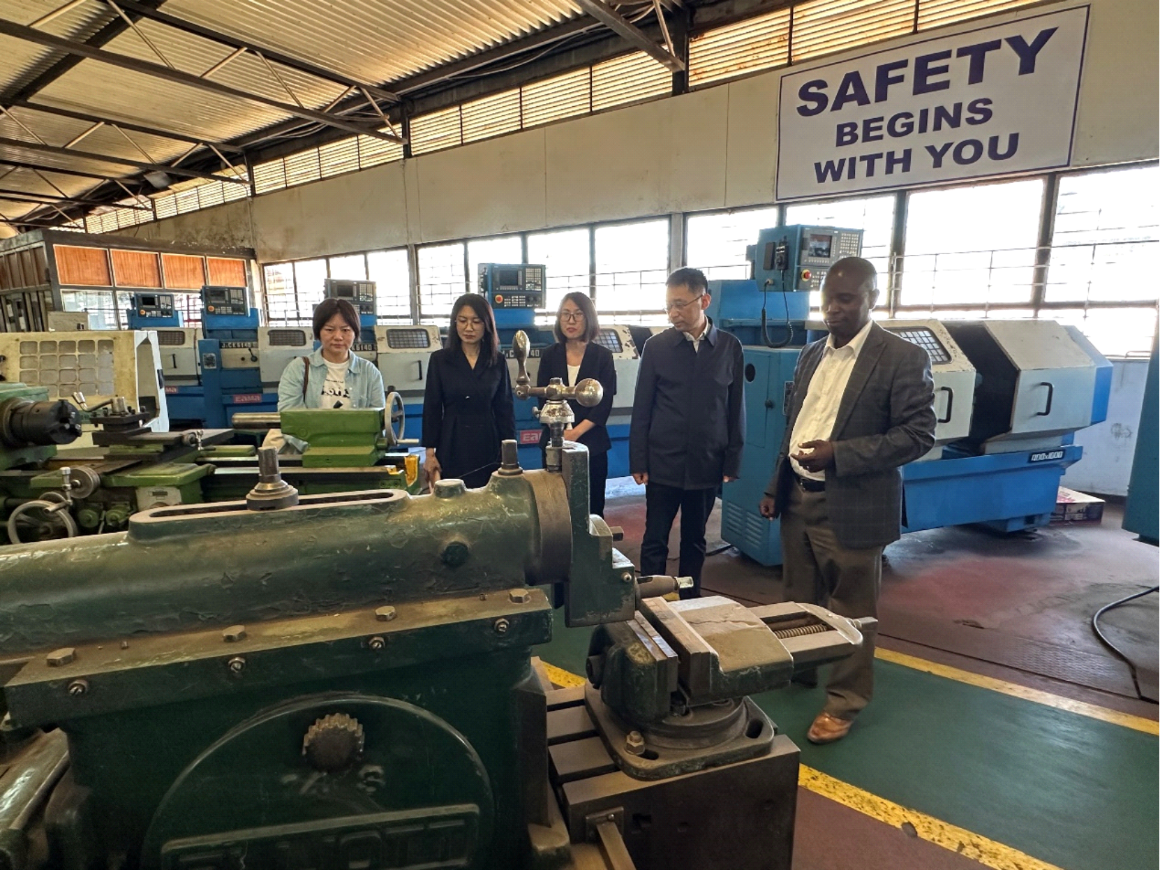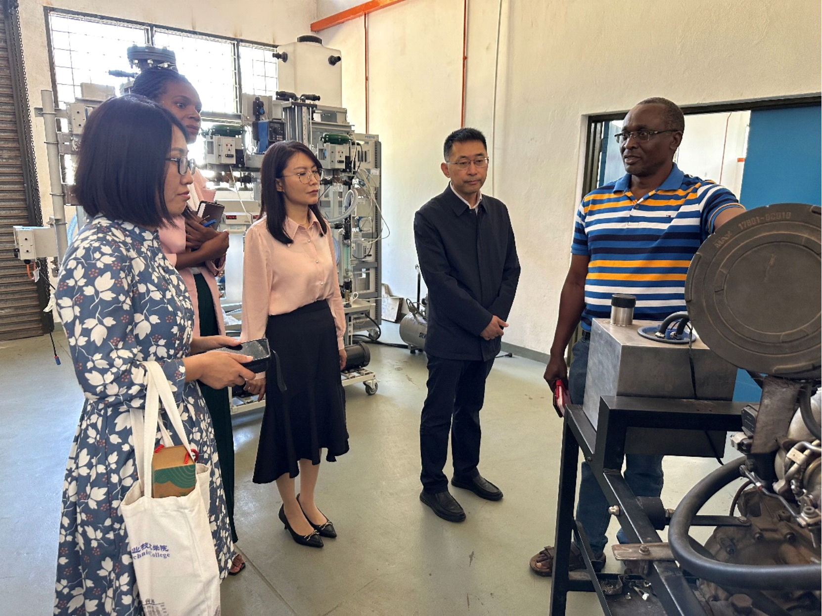 團組首先訪問了贊比亞的著名學府——贊比亞銅帶大學。在校長助理Olivia Chisha女士的陪同下,參觀了機械工程學院和土木工程學院等多個學院的實驗室及實訓室。CBU校長Nyambe教授和副校長Chisale教授接待了團組并舉行座談,CBU方面表示愿意在多個專業領域與我校進行深度合作,共同培養職業人才,并推動學分互認制度的實施。