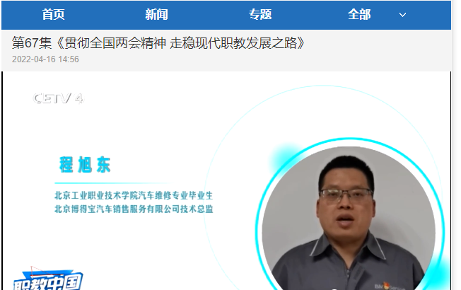 在節(jié)目中,我校校企合作企業(yè)——施耐德電氣(中國)有限公司公共事務(wù)總監(jiān)許屾,分享了施耐德電氣與我校合作辦學(xué)取得的經(jīng)驗(yàn)和對于繼續(xù)深化產(chǎn)教融合發(fā)展的建議;我校優(yōu)秀畢業(yè)生——北京博得寶汽車銷售服務(wù)有限公司技術(shù)總監(jiān)程旭東,分享了他在校求學(xué)期間學(xué)校真設(shè)備操作,真項(xiàng)目訓(xùn)練,真環(huán)境育人造就了他扎實(shí)的專業(yè)基礎(chǔ)和良好的技能水平。
